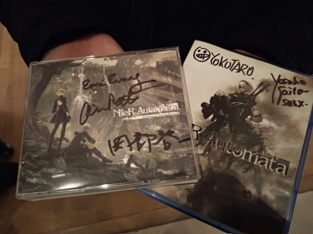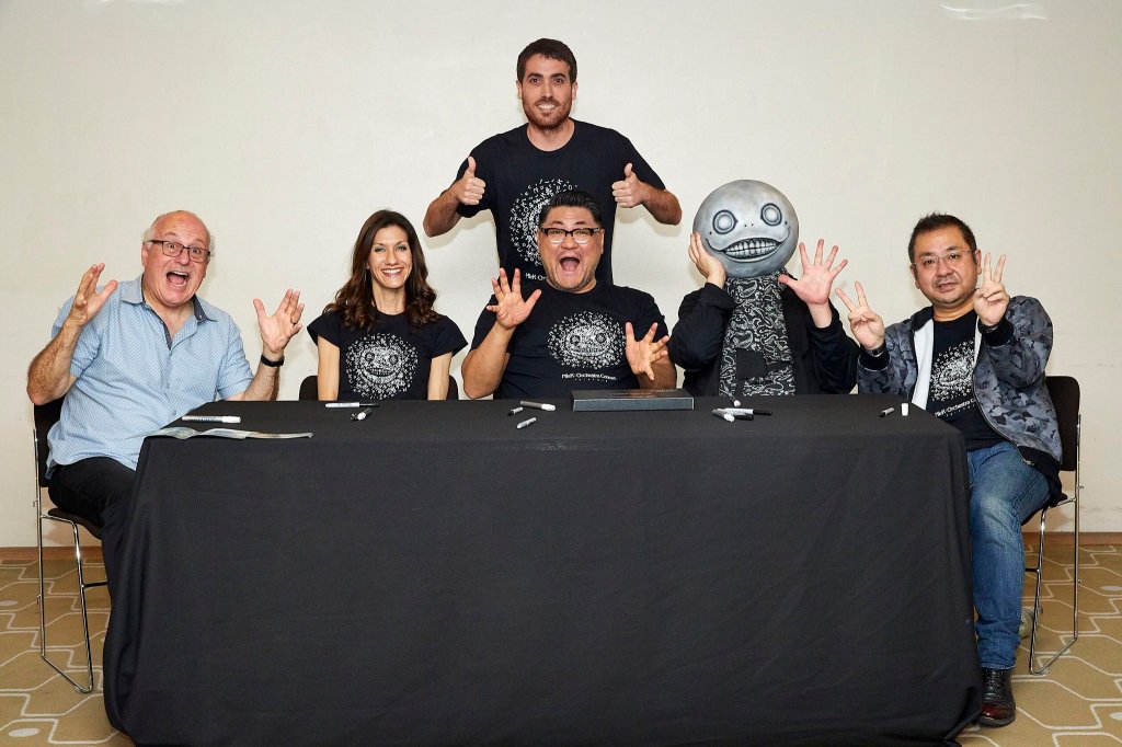 La experiencia no acababa ahí, y es que al finalizar el concierto pudimos acceder gracias a la entrada VIP a conocer a este maravilloso equipo. No todos los días se tiene la oportunidad de cruzar al menos unas palabras con ídolos de este nivel, y desde luego para nosotros es una alegría y una suerte inmensa. Como curiosidad, Yoko Taro no llevaba la máscara durante la firma y sólo se la ponía para la foto. Debido a ésto, no nos dejaban hacer fotos más allá de la que hacía el fotógrafo oficial. Por supuesto, por respeto a todos ellos, cumplimos con lo dicho. Tras saludarles y comentarles lo mucho que sentimos gracias a sus juegos, nos hicimos la foto con ellos para que quede inmortalizado ese momento para la historia.