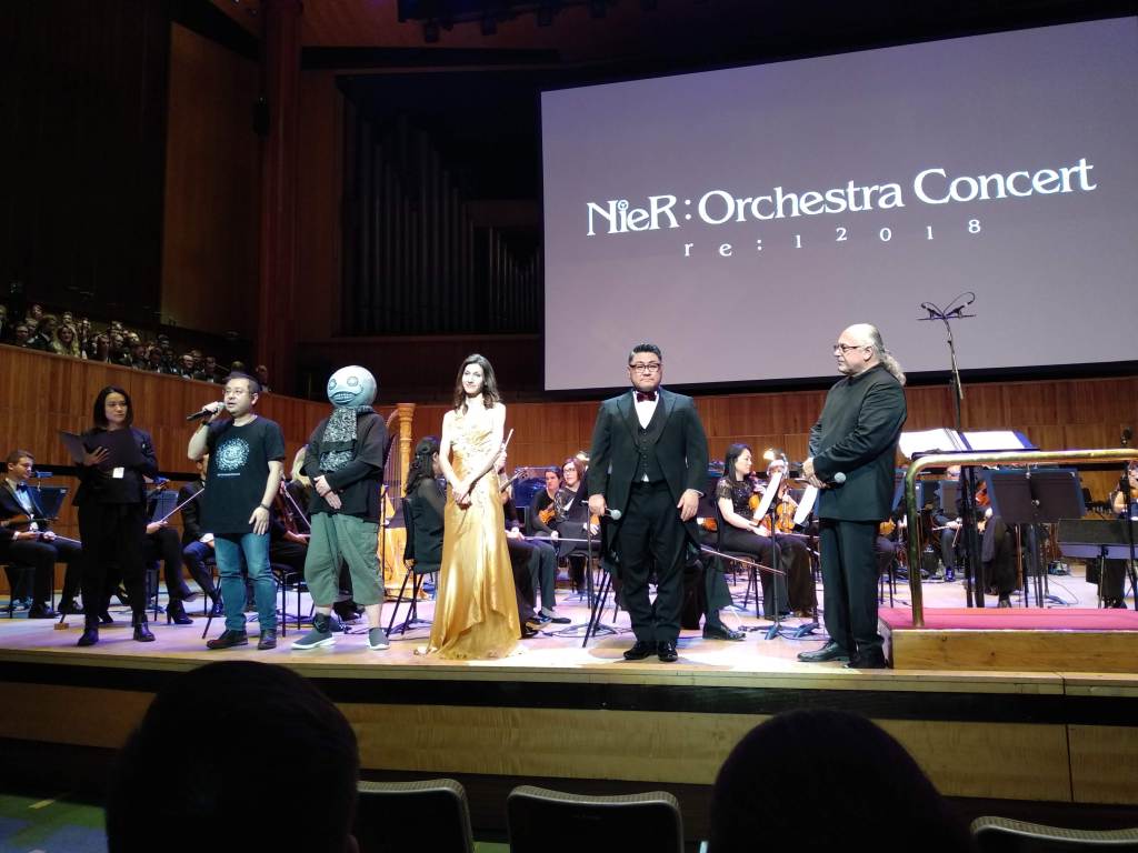 Tras algo más de una hora, llegaba el descanso en el que aprovechamos para comentar con los amigos la experiencia que estábamos viviendo. Uno de nuestros objetivos era, por cierto, el de ver a Yoko Taro sin la máscara. Debía estar sentado entre el público, pero no conseguimos localizarlo. Al reanudarse el concierto tras unos 20 minutos, empezaron a sonar los temas de Nier: Autómata. Una selección maravillosa en la que no faltaron «City Ruins«, «Amusement Park» o «Bipolar Nightmare«. Y para cerrar, volvía Emi Evans al escenario para interpretar «Weight of the World» y terminar de enamorarnos con su voz. Os aseguramos que pocas veces he vivido en cualquier concierto algo como lo que sentí en esta canción, los vellos de punta durante todos y cada uno de los segundos de interpretación.