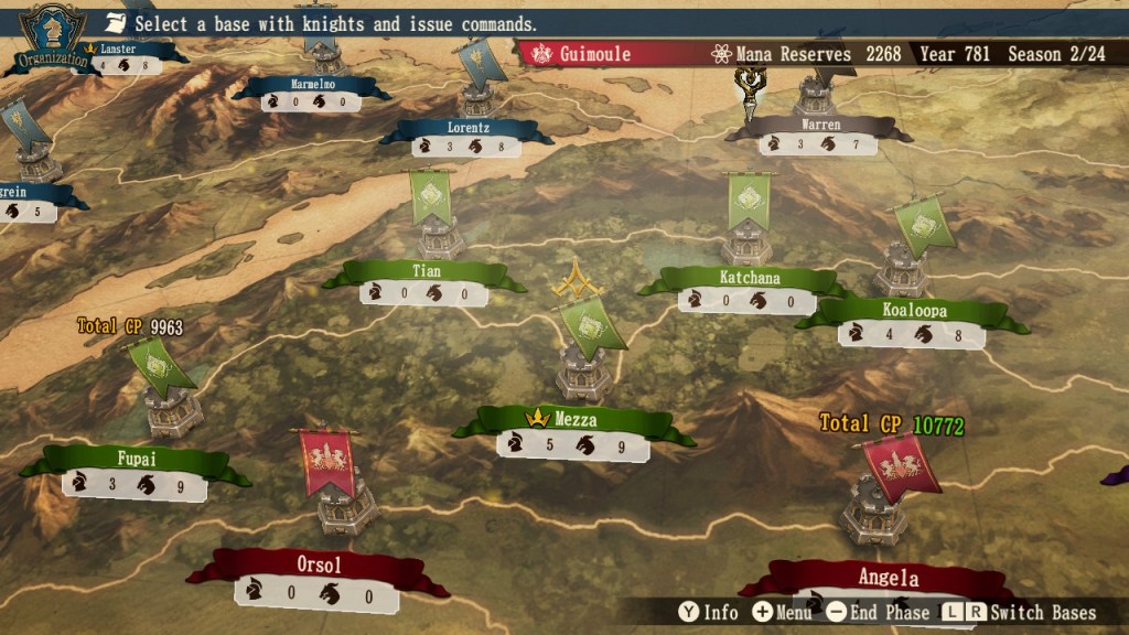 Comenzaremos en la “fase de organización”, en la cual deberemos gestionar nuestras tropas moviéndolas a diferentes bases, invocar monstruos para asignárselos a nuestros caballeros, mandar tropas a expediciones para que vuelvan en la siguiente estación con objetos u experiencia… ¡o incluso reclutar nuevos caballeros! También podremos equipar a nuestras unidades con objetos, subirlas de clase si reúnen las condiciones necesarias, cambiar los monstruos que lleva cada soldado e incluso revivir a los soldados caídos. Todo lo oportuno para prepararnos para la fase de ataque.