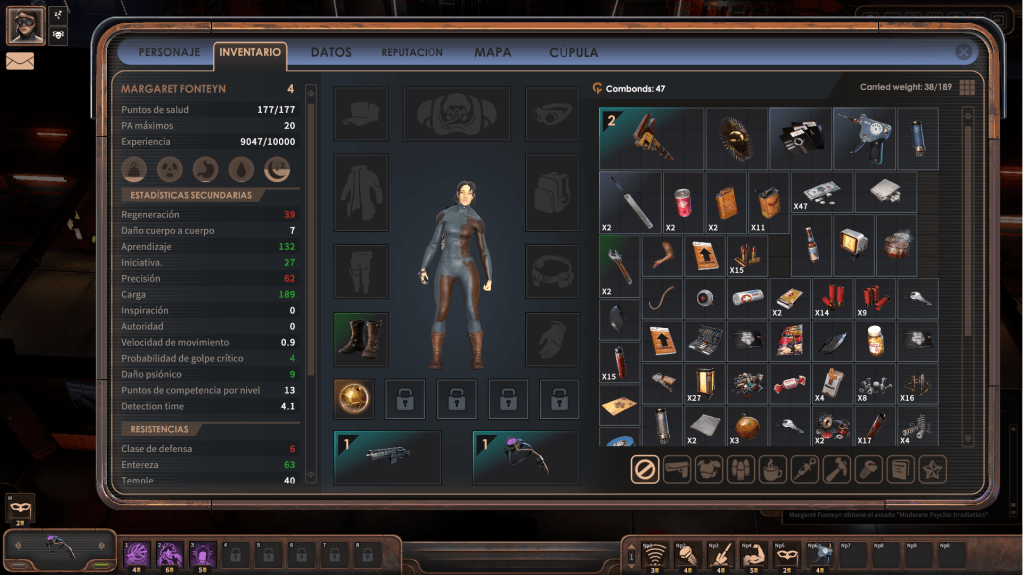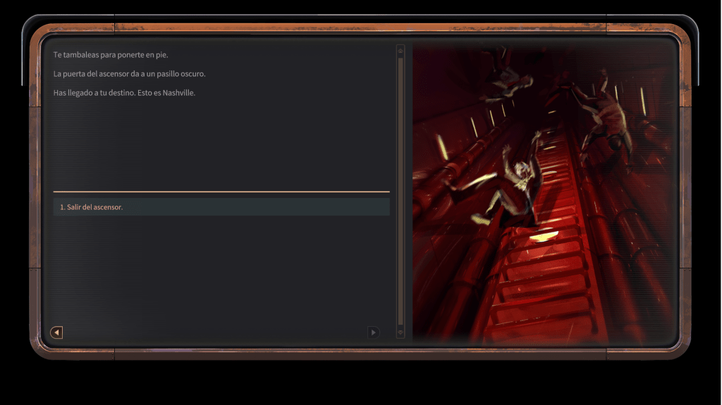 Encased nos ofrece una exploración libre, podemos movernos por el mapa haciendo clicks sobre el escenario e interactuando con los distintos objetos que hay (cajas, ordenadores, puertas y demás). Hay varios menús en los que puedes ver las características del personaje, los objetos que llevas, los podemos equipar a nuestro personaje y tener una vista previa de cómo luce con el atuendo y los complementos que le pongamos. Los menús son complejos, y al principio puede costar ver dónde está cada cosa, pero no es complicado acostumbrarse después e ir a lo que necesites sin problema.