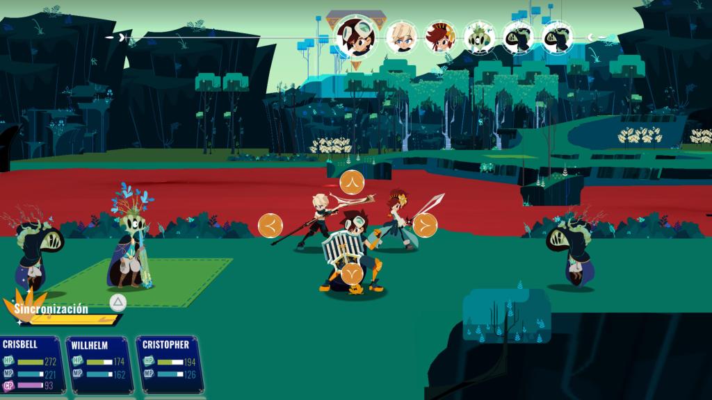 Los combates por turnos de Cris Tales se libran con nuestro equipo de personajes en el centro del escenario, y los enemigos se sitúan o bien a la izquierda del campo o bien a la derecha. En la parte superior de la pantalla podremos ver el orden en el que van a atacar nuestros personajes y los enemigos. Para atacar o usar una habilidad, deberemos dirigir el cursor hacia el lado que queramos atacar y seleccionar a un enemigo (o varios, si la habilidad en cuestión lo permite). Aquí también podemos usar las habilidades de cronomagia de Crisbell, enviando a los enemigos de la izquierda al pasado, y/o al futuro. Los enemigos pueden cambiar según la época a la que los mandes y esto puede inclinar la batalla a nuestro favor… ¡o no! Hay enemigos que pueden aprovechar el cambio temporal en nuestra contra, así que ten cuidado.