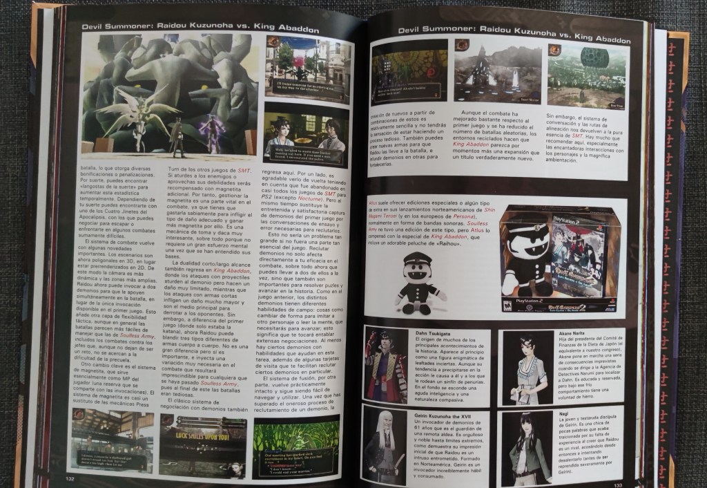 Al abrir el libro, un vistazo al índice en detalle nos sirve ya para ver que estamos delante de una colección muy exhaustiva que parece no dejarse nada en el camino. Tras unas palabras del autor principal (Kurt Kalata) y del interesante prólogo de Alejandro Pascual, entramos de lleno en el contenido principal. Un análisis detrás de otro en el que vamos a conocer todos y cada uno de los juegos que han formado parte de este mundo. Desde el primer Megami Tensei hasta el último de los Persona, pasando por Devil Summoner, Last Bible, todos los spin-offs existentes (los Persona Arena, el Card Summoner de GBA que no salió de Japón…). Las distintas versiones y revisiones de todos los juegos también se incluyen y creedme si os digo que agradezco muchísimo tener un lugar en el que mirar las diferentes versiones de un vistazo rápido. No echamos de menos absolutamente nada. Además, aún quedan páginas para comentar los distintos mangas que han nacido a través de estos juegos, las series y películas de animación y las novelas. En este sentido es desde luego el libro más completo que podamos imaginar, cumpliendo la función ya no sólo de guía si no de enciclopedia de esta serie tan desconocida hasta hace nada en nuestro país.