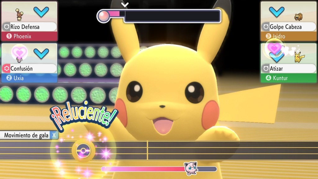 Por otro lado, también tenemos los concursos Pokémon, que se han convertido en un minijuego cooperativo de ritmo en el que tendremos que pulsar las notas en el momento adecuado. Conseguiremos más puntos según el movimiento que equipemos y las cualidades (carisma, belleza, etc…) del Pokémon en cuestión, en base al concurso que nos hayamos apuntado. Podremos mejorar estas cualidades usando pokochos que podremos cocinar, moviendo el joystick para mover el pokocho mientras se cocina.