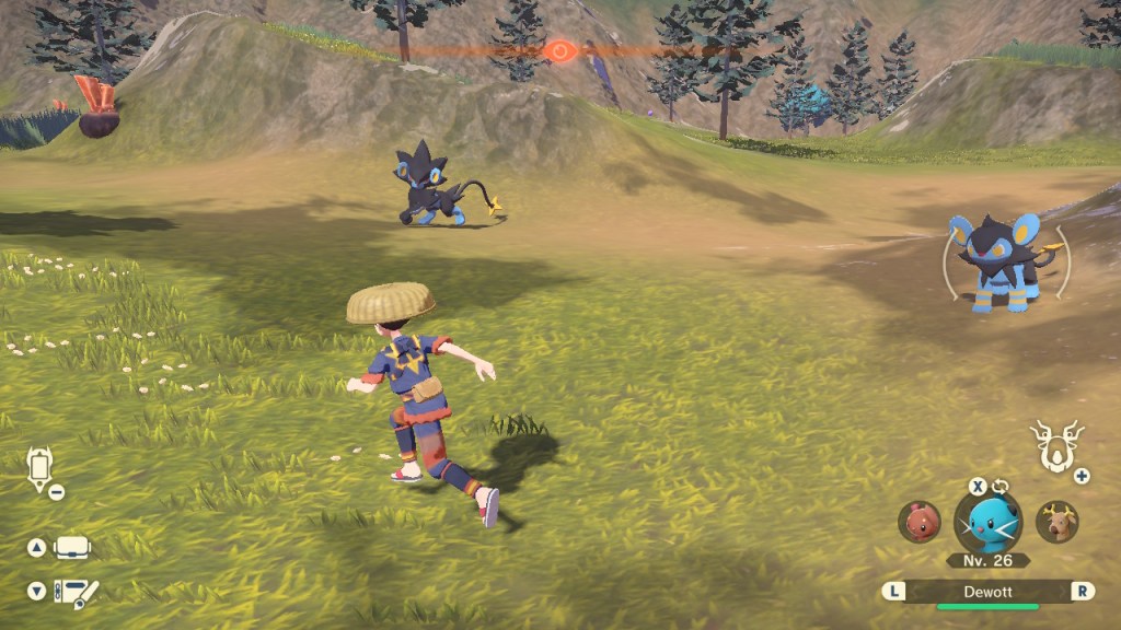 Los biomas, como hemos apuntado, son bastante grandes y el juego nos invita a explorar a ver qué Pokémon nos podemos encontrar por el camino, y podremos llevarnos horas explorando tranquilamente hasta que nos apetezca continuar con las misiones principales y secundarias, a pesar de que al principio estaremos bastante limitados por las acciones básicas del propio protagonista. A veces, podremos encontrarnos con Pokémon más fuertes de lo normal, denominados Pokémon “alfa”, caracterizados por ser más grandes de lo normal, tener los ojos rojos, y ser bastante más fuertes que el resto de Pokémon de su especie. Hay que tener mucho cuidado con ellos, pero si somos lo suficientemente hábiles, ¡podemos incluso capturarlos sin necesidad de entrar en combate! También nos encontraremos otros Pokémon conocidos como «señoriales», que vienen a ser los «jefes», contra los que lucharemos con nuestro protagonista directamente lanzando esferas y esquivando sus ataques, y sacando a nuestros Pokémon a combatir cuando se presente la ocasión.