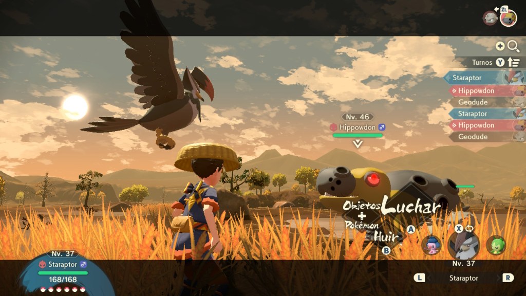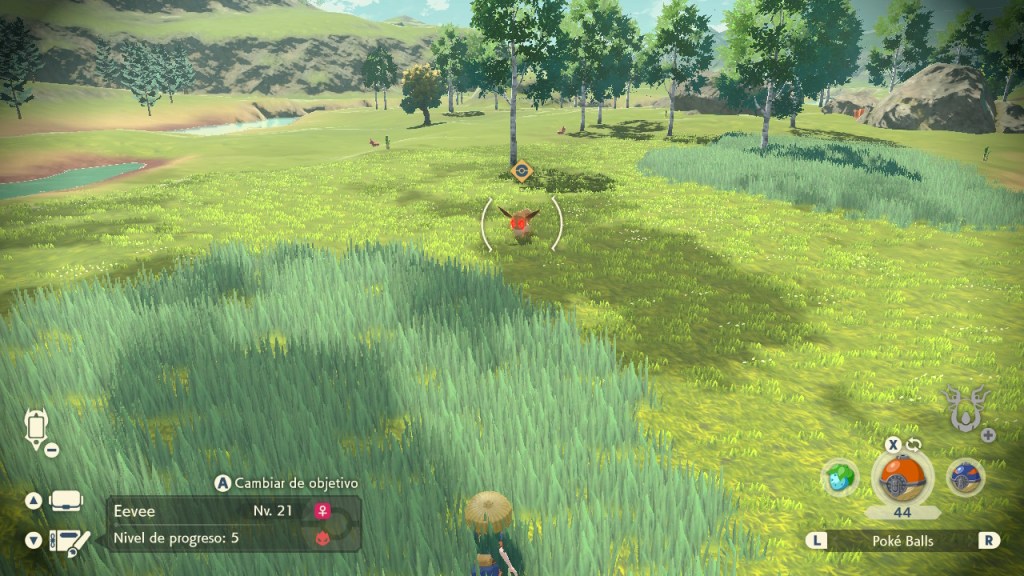 Aquí ya podremos jugar con las mecánicas que nos ofrece el juego para capturar Pokémon. Podremos optar por ser sigilosos, acercarnos con cuidado, lanzar comida cerca del Pokémon para que vaya a comérsela, capturarlo mientras esté distraido… ¡o bien entrar en combate para capturarlo! Se puede hacer de varias maneras, unas más o menos eficaces dependiendo de la criatura que vayamos a capturar. También tendremos más posibilidades de éxito si lanzamos una ball a la espalda del Pokémon, pillándolo desprevenido. O también podemos ir a la antigua usanza, sacamos a nuestro Pokémon para combatir, y dejamos al rival con poca vida para capturarlo. ¡Podemos enfocar nuestra captura como queramos! También, podemos tener un equipo de hasta 6 Pokémon, y si capturamos uno y nuestro equipo está lleno, será enviado automáticamente a los rediles de Villa Jubileo, que hacen las veces de cajas del PC en anteriores entregas de la saga.