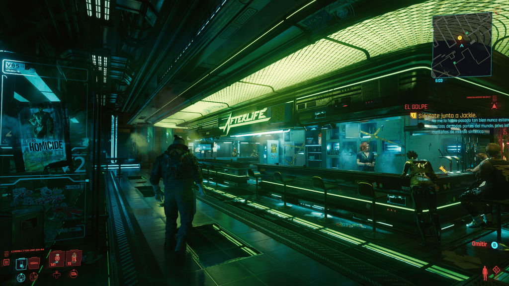 V es un personaje complicado de analizar. Porque la conexión entre V, Night City y sus habitantes es en realidad la conexión que existe entre el jugador y el juego; subyace en cada decisión que he tomado para librarme de cada situación, cuando el juego me ha puesto contra la espada y la pared. No obstante, no puedo negar que V es un personaje muy interesante a pesar del pobre trasfondo que hay al seleccionar la clase al inicio del juego (Nómada, Corpo y Buscavidas). Lo es porque, más allá de esas clases primarias que pueden darnos más opciones en los diálogos, V tiene personalidad y funciona como personaje autónomo. Y gran parte de su encanto tiene que ver con el doblaje al castellano, un trabajo espectacular a todos los niveles, especialmente en V femenina, donde Beatriz Berciano realiza un trabajo de doblaje sencillamente magistral.