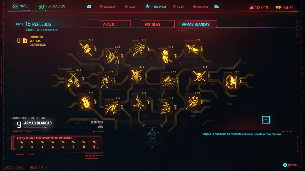 La verdad está delante y no la puedo negar. Como RPG sin más, Cyberpunk 2077 es un juego más superficial de lo que parece. Una vez dentro del menú de habilidades, es casi abrumador observar las opciones disponibles. Existen varios árboles de habilidades que nos permiten construir un personaje a medida… en parte. ¿Por qué? Porque en el fondo, no existe ninguna skill que desbloquee un nuevo patrón jugable. Se trata en su gran mayoría de «perks» que potencian lo que ya tenemos desde un principio: un extra en el daño crítico, un porcentaje de acierto, otro de defensa… hay muchos según el arma que deseemos usar; pero todo se reduce a la mínima expresión: hacer más con lo que ya tienes. Me habría encantado un punto de excelencia en este apartado, más aún cuando el trasfondo argumental deja libertad creativa para diseñar mecánicas jugables a placer. Además, antes del parche 1.5, cualquier «build» estaba rota en el «mid/late game»; pudiendo ocasionar un daño desorbitante configurando a V adecuadamente. Por fortuna, con el parche de nueva generación esto se ha corregido y muchas de las habilidades han sido revisadas y balanceadas.