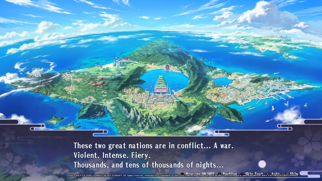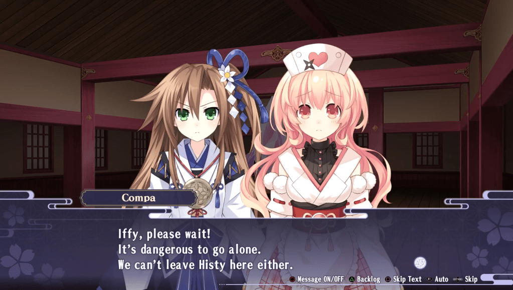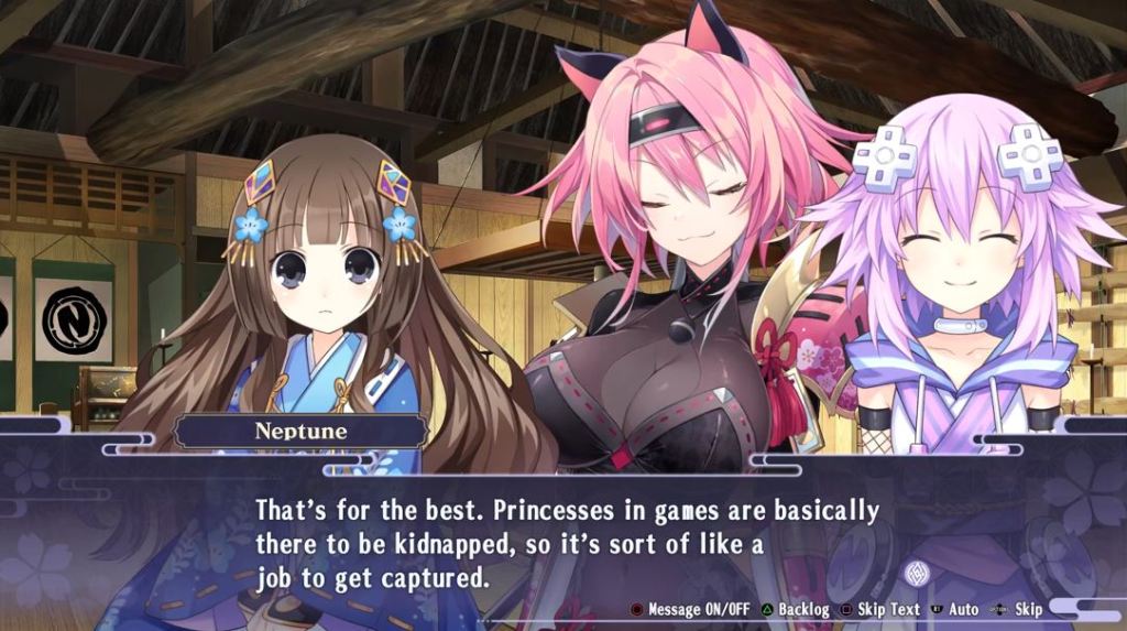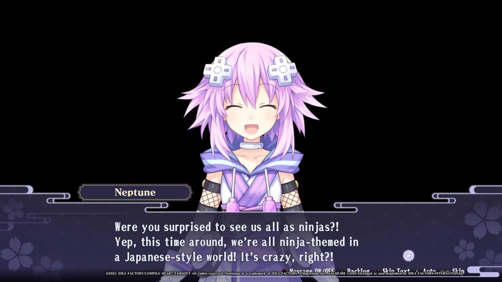 Pues nos encontramos en un mundo: Gamninjustri (combinación del nombre del mundo de Neptunia añadiendo el -ninj- para referenciar el aire ninja), dividido en una nación por dos partes: una más grande y otra más pequeña, controladas cada una por un Daimyo (que vendría a ser un Señor Feudal japonés).