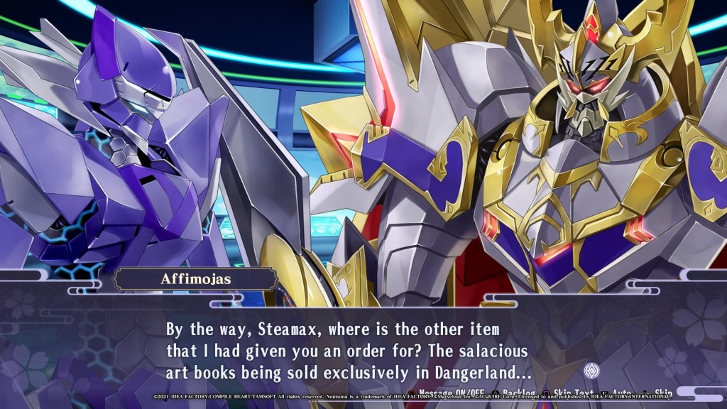 Por supuesto no me olvido de los carismáticos antagonistas Affimojas y Steamax, viejos conocidos de la saga Neptunia, quien en este crossover están aliados con Yoh Gamer. Steamax siente una profunda admiración por Affimojas y gran afinidad, ya que comparten aficiones.