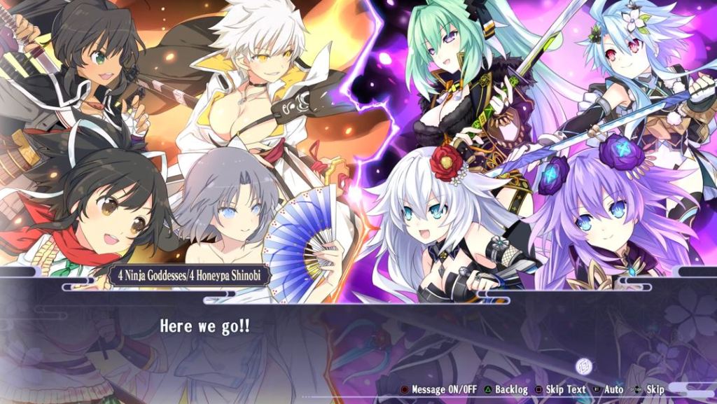 Cuando cae la noche, Las Cuatro Diosas Ninja de Heartland, campeonas del Estilo Compa se enfrentan a Las Cuatro Shinobi del Estilo Honeypa de Marveland. Aquí ya encontramos los primeros guiños en Heartland y Marveland, haciendo referencia a las desarrolladoras de cada juego: Compile Heart (y las Diosas de Neptunia en sí) y Marvelous Entertainment.