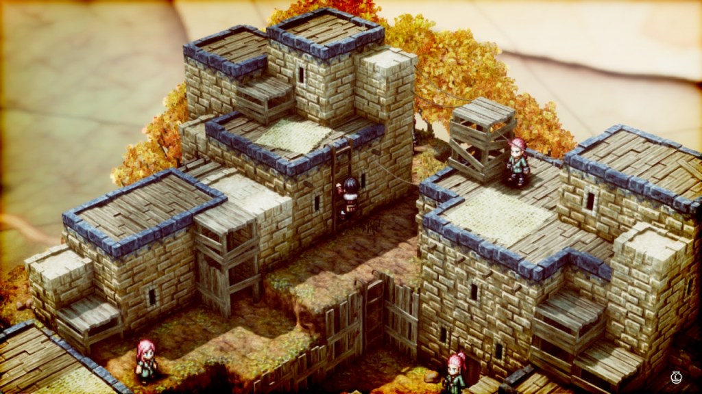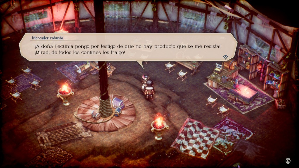Poco después de comenzar nuestra historia en Triangle Strategy, tendremos acceso al campamento: un lugar en el que podremos prepararnos para las batallas que tengamos por delante. Tendremos un mercado en el que comprar con el dinero que consigamos en las batallas, un almacén en el que podremos comprar con puntos de valentía, que obtendremos haciendo determinadas acciones, como atacar por la espalda, atacar a varios enemigos a la vez, etc. Además, disponemos de una herrería donde mejorar a nuestros personajes, y una taberna donde podremos jugar en batallas secundarias para practicar y subir de nivel. Además, con un objeto especial y a partir de cierto nivel, podremos ascenderlos de clase en el almacén.