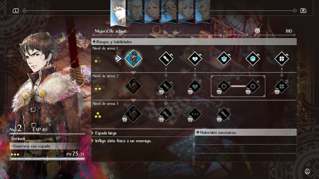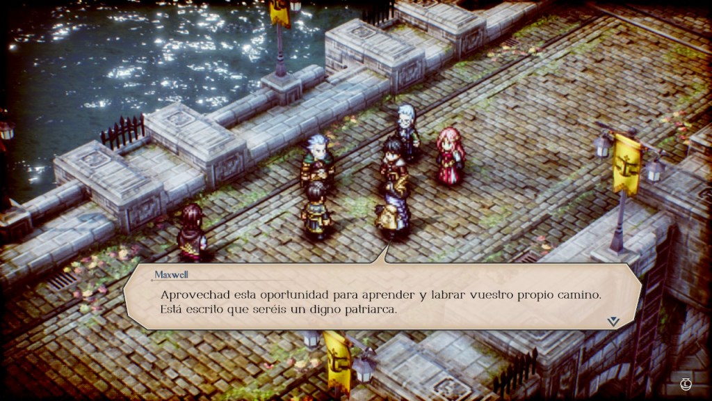 También tendremos momentos, previos a las batallas o cuando vayamos a tomar una decisión con la balanza, en los que podremos explorar el escenario libremente y hablar con los personajes que nos encontremos, comprar y buscar objetos o recopilar información que también nos puede ser útil a la hora de hablar con un compañero sobre qué decisión tomar. Cuando hablemos con algunos personajes que tengan encima un símbolo de exclamación, significa que tendremos una conversación en la que tendremos que elegir una de tres opciones de diálogo, cada una asignada a una de las convicciones de Serinoa: Moralidad, Libertad y Pragmatismo. No veremos qué convicción está asignada a cada decisión, pero dependiendo de la que elijamos, la puntuación de esta convicción aumentará. También se darán situaciones como estas a medida que avancemos en la trama, y dependiendo de nuestras convicciones, se unirán a nuestro equipo unos personajes u otros.