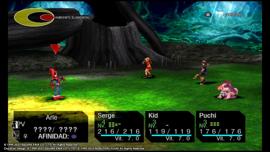Sí que encontramos que quizás el sistema ha envejecido regular y nos vendrán genial algunas de las características que se han incluido en esta Radical Dreamers Edition, sobre todo para los menos pacientes o los que no estén muy acostumbrados a este tipo de RPGs. Con un simple botón podremos acelerar el tiempo para que esas magias e invocaciones que se llevan un tiempo de más en ejecutar podamos verlas mucho más rápido. Viene especialmente bien ya que la remasterización no está demasiado pulida y tendremos tirones importantes, una pena ya que el juego merecía en ese sentido mucho más cariño. También está disponible el efecto contrario, por si necesitamos que algo vaya más lento (muy útil con cierto minijuego…) y las ya típicas opciones de estas remasterizaciones como atacar automáticamente o evitar las batallas normales (especialmente útil en este juego, en la que no sirven para mucho al subir «niveles» sólo cuando vences a ciertos jefazos). Además se han actualizado los diseños de los personajes, se ha dejado ver nuevo arte oficial que es absolutamente maravilloso y, lo más importante, la traducción a nuestro idioma tanto de Chrono Cross como de Radical Dreamers.