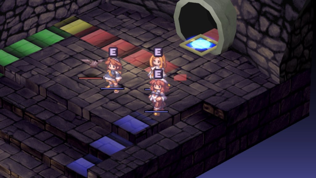 En las batallas comenzamos en un escenario plagado de enemigos con los que lidiar. En algún punto del escenario habrá un punto de respawn en el que puedes llamar a tus personajes y maniobrarlos por el campo de batalla. También habrá un punto de salida justo detrás del punto de respawn. En cualquier momento de la batalla puedes hacer que uno de tus personajes vaya a la salida para abandonar el combate y así evitar perder la experiencia o el dinero.