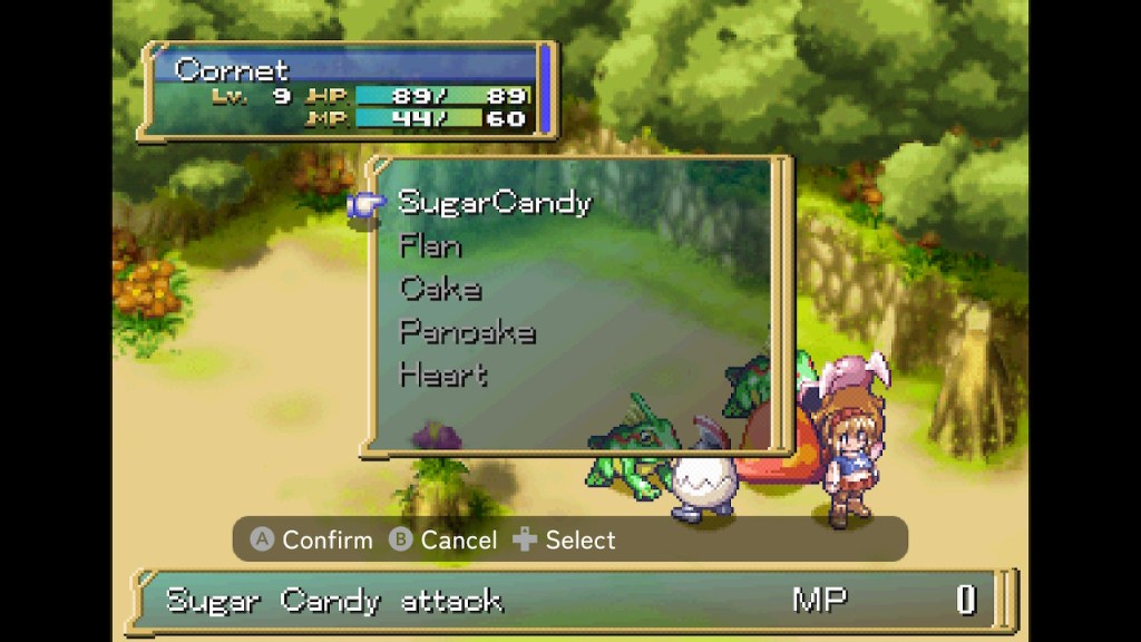 Cornet durante los combates puede hacer sonar su trompeta para potenciar sus marionetas y ganar puntos de apreciación, lo que le permite desatar técnicas tan devastadoras para los enemigos como cómicas, ya que los ataques especiales están relacionados con los postres.