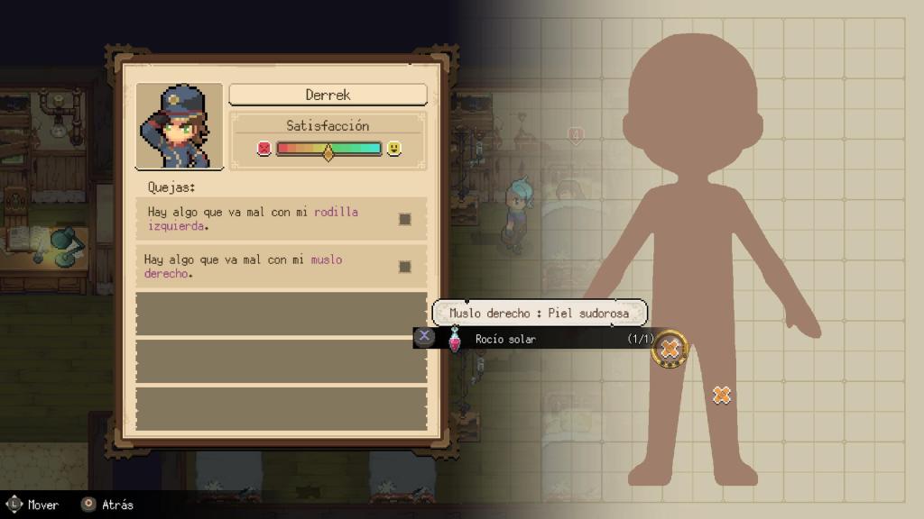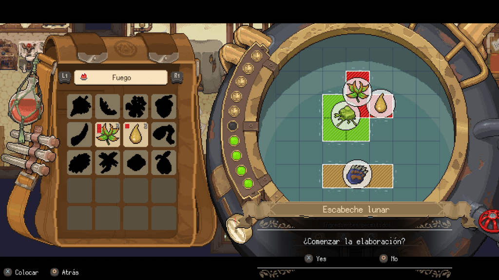 Comenzamos nuestra nueva vida en Moonbury aprendiendo cómo funciona la mecánica de elaboración de pociones, cada ingrediente dispone de uno o varios espacios con ciertas formas, dichos ingredientes deben encajar en un determinado patrón para elaborar cualquier poción que necesitemos a la hora de tratar a nuestros pacientes.