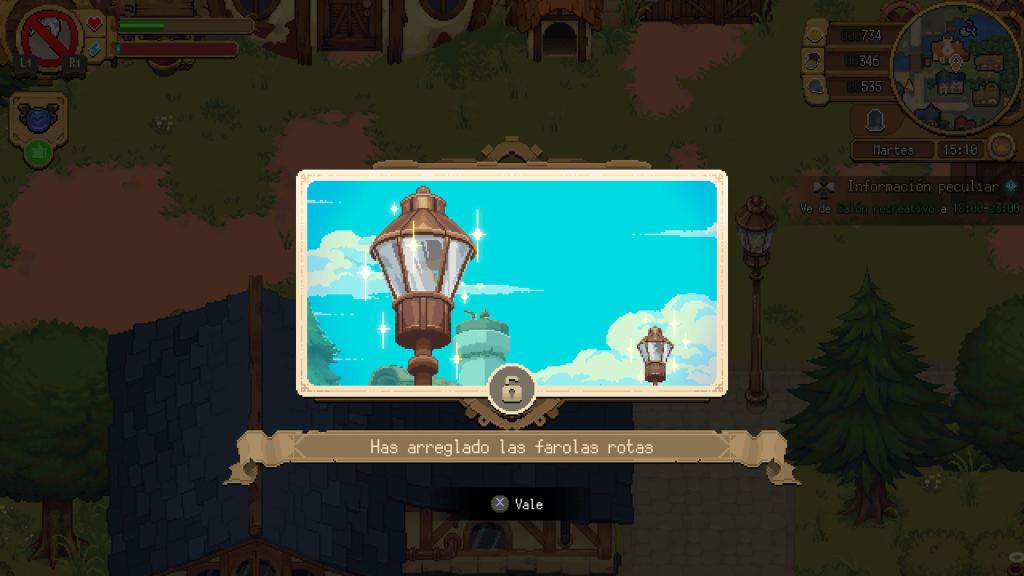 Tanto el pueblo como los diseños de los personajes transmiten mucha personalidad. Sin lugar a dudas se ha prestado una especial atención al detalle en el pixel art, consiguiendo crear tanto un entorno vivo como un hermoso pueblo para explorar.