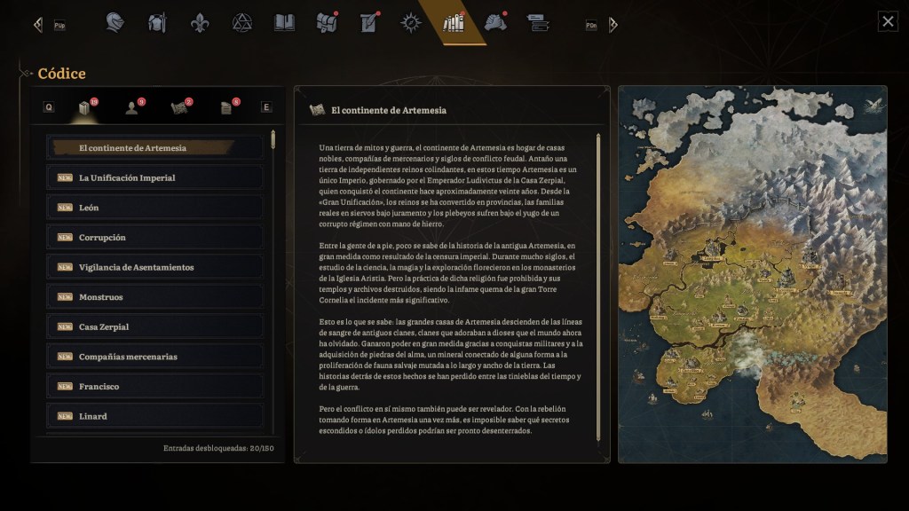 Ocean Drive ha tenido la amabilidad de escribir un completo códice que recoge toda la información importante sobre Artemesia, sus reinos y sus gentes. Un gran caudal de información que podemos consultar en todo momento para zambullirnos tanto como queramos en su inmenso lore. Para nuestra sorpresa, las raíces de su historia son más profundas de lo que nos habíamos imaginado, y abarcan un enorme compendio que relata las costumbres, forma de vida y muchos otros detalles, así como información sobre cada uno de los personajes importantes del juego. Y lo cierto es que todo este trasfondo argumental está bien cohesionado y añade una interesantísima capa a su bien construido argumento.