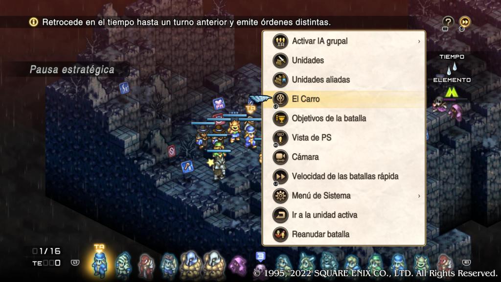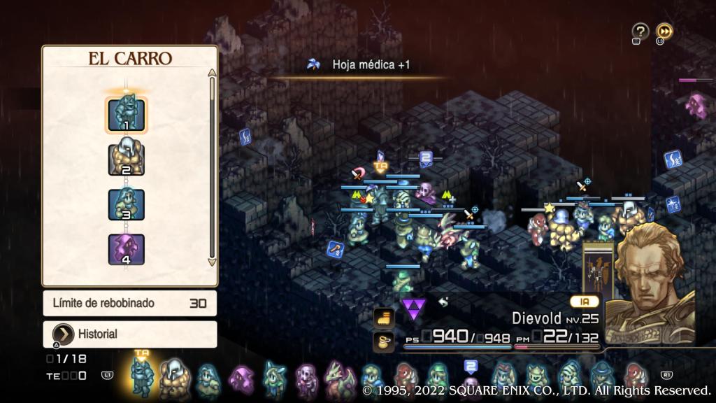 La nueva IA es especialmente hábil y muy “cuca” a la hora de atacar a nuestras tropas, ya que reconocen quienes son los más vulnerables de nuestro equipo y trataran de aniquilarlos primero, usualmente suelen ser a los personajes de apoyo y/o magos, que son los que nos permiten brindar beneficios, curar y revivir a los personajes caídos en batalla, hay que tener en cuenta en este caso que únicamente tenemos tres turnos para poder revivir a cualquier caído en batalla, bien con algún objeto o usando un hechizo de resurrección, si muere desaparecerá de nuestro equipo para siempre. Otra opción que tenemos en combate es la de utilizar el sistema del Carro, el cual se introdujo en la versión de PSP, con el que podemos volver atrás en el tiempo varios turnos para replantearnos la estrategia si hemos cometido algún error.
