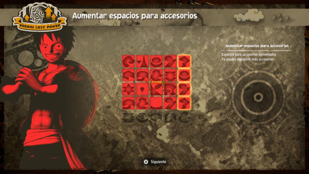 Subir de nivel solo nos otorga un aumento de atributos por lo que solo obtendremos nuevas técnicas y habilidades de combate después de vencer a los distintos guardianes de la isla Waford tras completar un arco. Para seguir mejorando al personaje tendremos diversos accesorios para colocarlos en un tablero asignado a cada personaje, cada uno de ellos con diversas mejoras como más puntos de ataque, vida, etc. Por desgracia, al principio tendremos un espacio limitado para colocar varios accesorio, conforme vayamos avanzando en la historia obtendremos una mejora que nos aumentarán las casillas, dejándonos equiparnos con más accesorios.