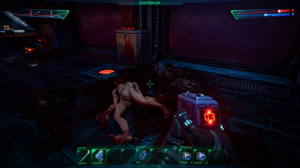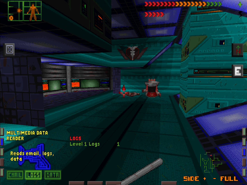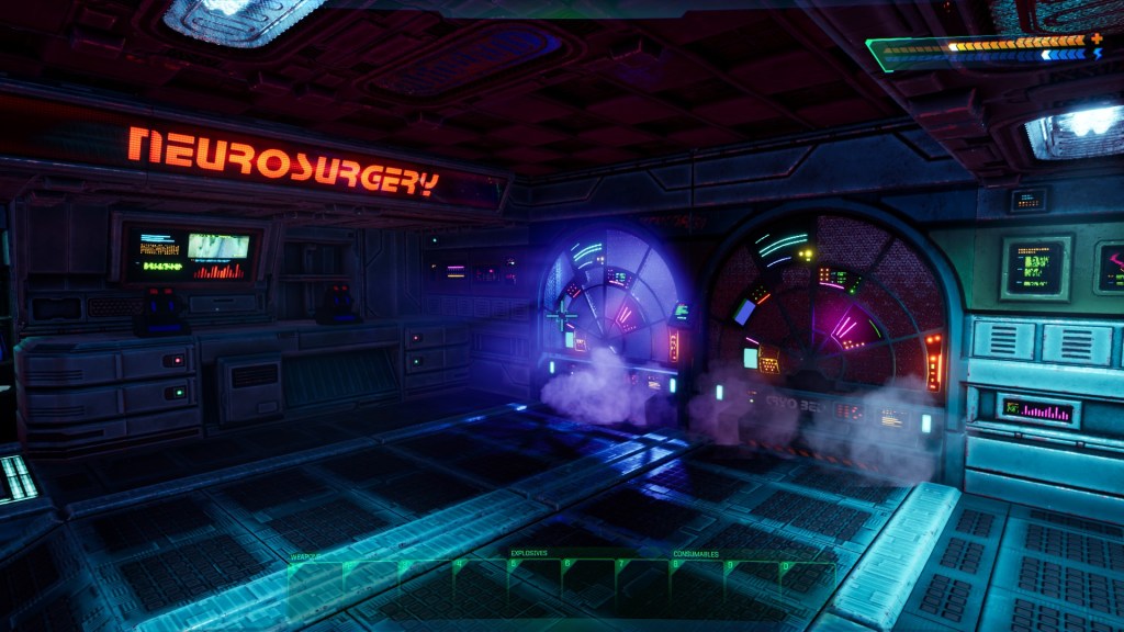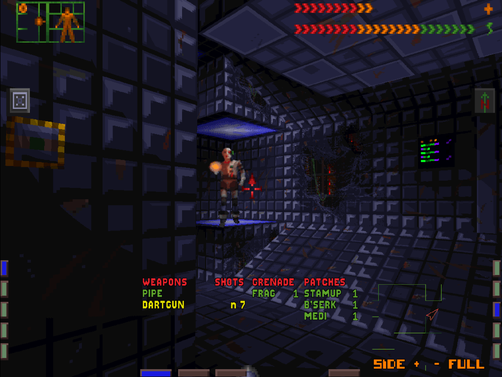 Como decía, es un juego que sabe poner las cosas muy difíciles al jugador. No solo porque se desprende de las herramientas habituales modernas para situarnos en un escenario, también es un RPG cuya jugabilidad tiene su origen en otros tiempos, en una época donde no se hacían concesiones. System Shock no es un shooter, y en más de una ocasión me he tenido que recordar esto mientras recorría la Ciudadela buscando la salida a mis problemas. La munición escasea, y más escasos aún son los objetos curativos. Esto, que a priori puede frenar a muchos, es una auténtica gozada por la sensación de agobio constante que transmite. No es un videojuego de terror, pero sentirás verdadero miedo al verte escaso de recursos para avanzar. Pocos juegos me han transmitido una sensación de fragilidad semejante.