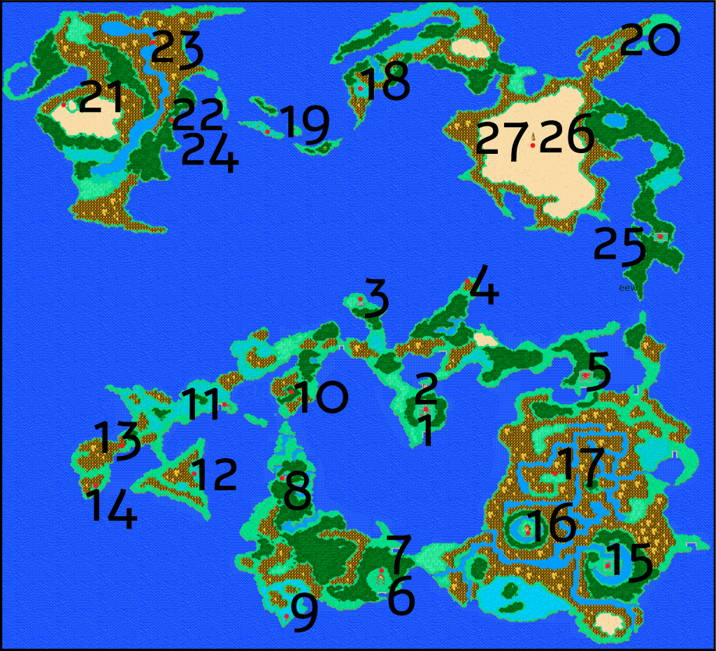 Incluye cualquier ciudad, cueva, torre, castillo y mazmorra. Hay localizaciones que no son necesarias de visitar en la historia así que tendrás que tenerlo en cuenta. Las marcaré en rojo en la siguiente lista. El trofeo deberá saltarte nada más entres en la fortaleza voladora, aunque no te preocupes si te dejas alguno para ese momento ya que podrás visitar el resto de localizaciones en cualquier momento.