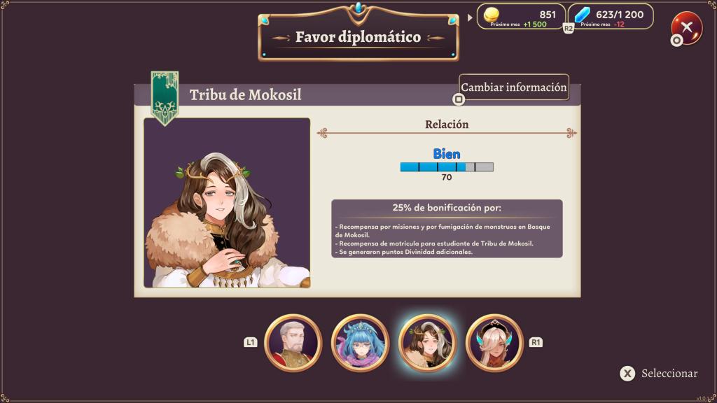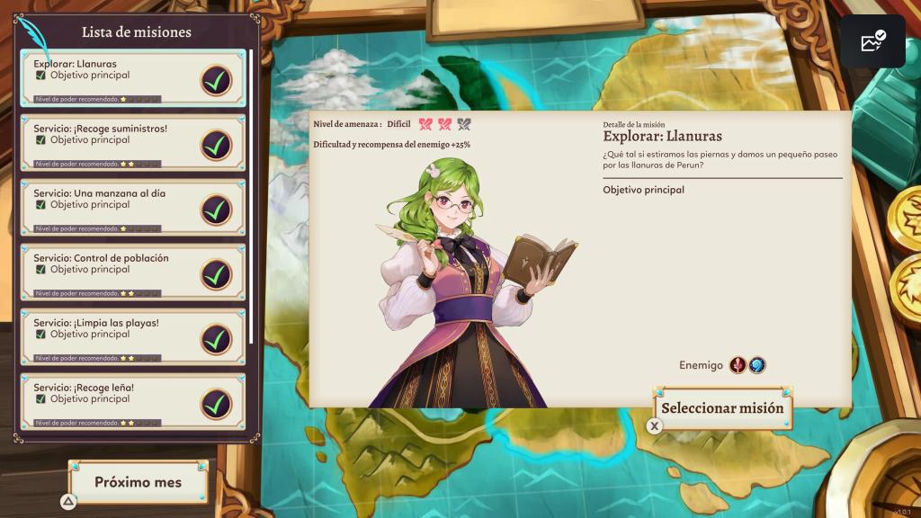 Las misiones del juego tienen lugar antes de cambiar de mes, en el menú encontraremos una lista de las regiones que podemos visitar dependiendo del momento de la historia en la que nos encontremos. Cada región cuenta con una serie de misiones secundarias que podemos realizar para obtener recompensas o directamente seguir con la historia principal.