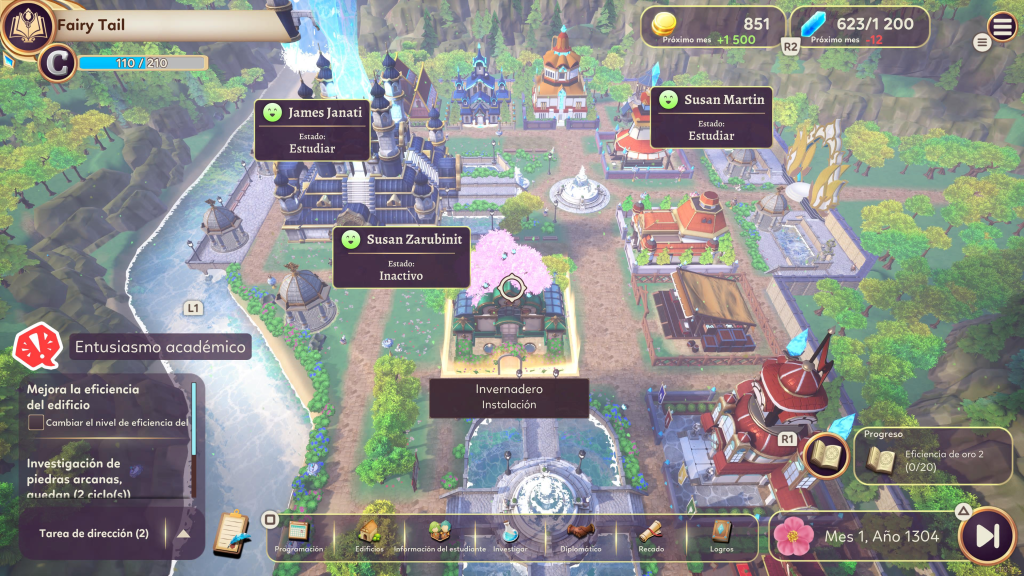 Hay 4 árboles de itinerario distintos, físico, magia, divinidad y arcanología. Cada vez que ponemos a un estudiante a estudiar alguna habilidad irá perdiendo resistencia. Si se acaba, no nos quedará más remedio que dejarles descansar durante el mes.