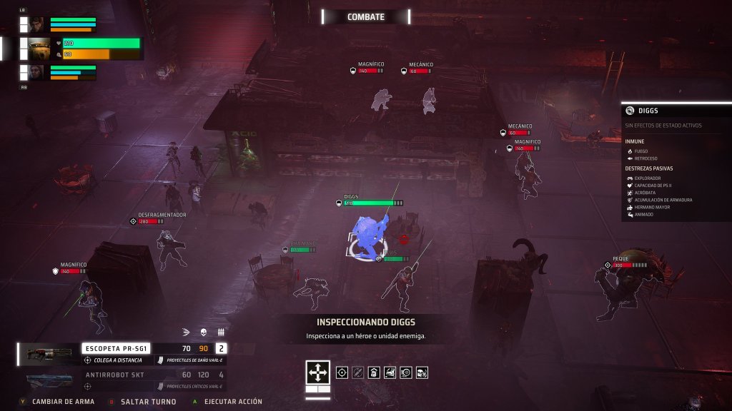 Por suerte, no estamos solos en esta lucha. A Elvis y Diggs los acompañarán otros personajes jugables, cada uno con sus habilidades y puntos fuertes. Mención especial a la habilidad de Elvis de controlar la Miasma, que viene a ser algo similar a los clásicos hechizos de cualquier RPG. Este poder consume kilovatios y no podemos abusar de ellos, pero sus características únicas despliegan en el campo de batalla una serie de efectos muy útiles, como lanzar un tornado que cambie a las unidades contrarias de lugar, invocar enemigos para que luchen a nuestro favor, entre muchos otros. Esto, junto con las diferentes armas que encontraremos en las tiendas o en los escenarios -todos los personajes pueden equiparse con todas, por cierto-, terminan de construir una capa de RPG ligera pero muy bien pensada.