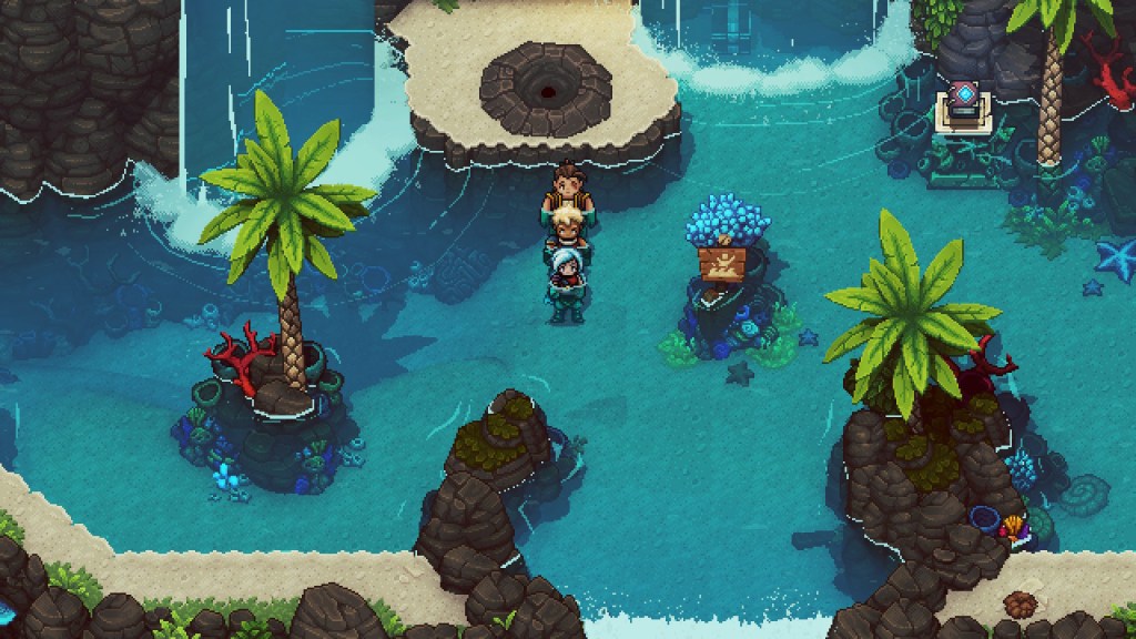 Existe algo que nos llama especialmente la atención mientras exploramos y es la belleza del pixel art de Sea of Stars pero es que además, nuestros personajes están perfectamente animados en tres dimensiones creando un mundo muy hermoso donde nos desplazamos de una forma muy fluida y nada acartonada. Nos desplazamos de localización en localización por un hermoso mapamundi con nuestros personajes a escala, que consiste en una serie de islas de un tamaño moderado y con temáticas de todo tipo. No os quiero romper sorpresas pero cuando pensáis que ya han tocado todo los tipos de ambientación que podían tocar siguen sorprendiendo con alguna nueva temática.