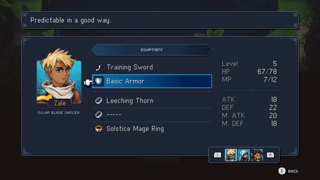 Al empezar la partida podremos elegir a quien queremos tener de protagonista principal. Las opciones son Zale hijo del Solsticio de Verano que usa Magia Solar o a Valere hija del Solsticio de Invierno que usa magia Lunar y realmente no supone mucha diferencia la elección salvo que dependiendo de nuestra elección siempre deberemos llevar a ese personaje en nuestro grupo.