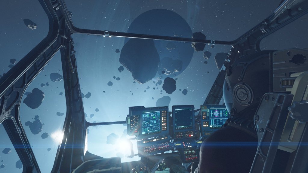 No podemos decir lo mismo de la exploración en el espacio. Aunque nunca se promocionó a Starfield como un simulador de pilotaje, nos ha chocado ver lo poco atractivo que resulta orbitar alrededor de los planetas con nuestra nave. Este escenario, la órbita, es un espacio muy grande donde podemos combatir -ya llegaremos a eso más tarde- contra ciertos enemigos y facciones, pero la representación jugable de la exploración espacial es tan pobre que llama nuestra atención. Las distancias son enormes, y gráficamente el cosmos está bien representado, pero no hay mucho que hacer «ahí fuera» salvo que en algún sistema específico exista una misión concreta y debamos atracar en alguna estación espacial. Básicamente, el espacio alrededor de los planetas es una antesala más antes de tomar tierra donde, como mucho, aparte de los combates, podemos entablar conversaciones con alguna nave, y salvo que Bethesda añada más contenido a posteriori, no pasaremos volando mucho tiempo. Por cierto, tampoco podemos aterrizar en tiempo real -de nuevo, más pantallas de carga-, ni viajar a otro planeta manualmente, cosa que nos habría gustado.
