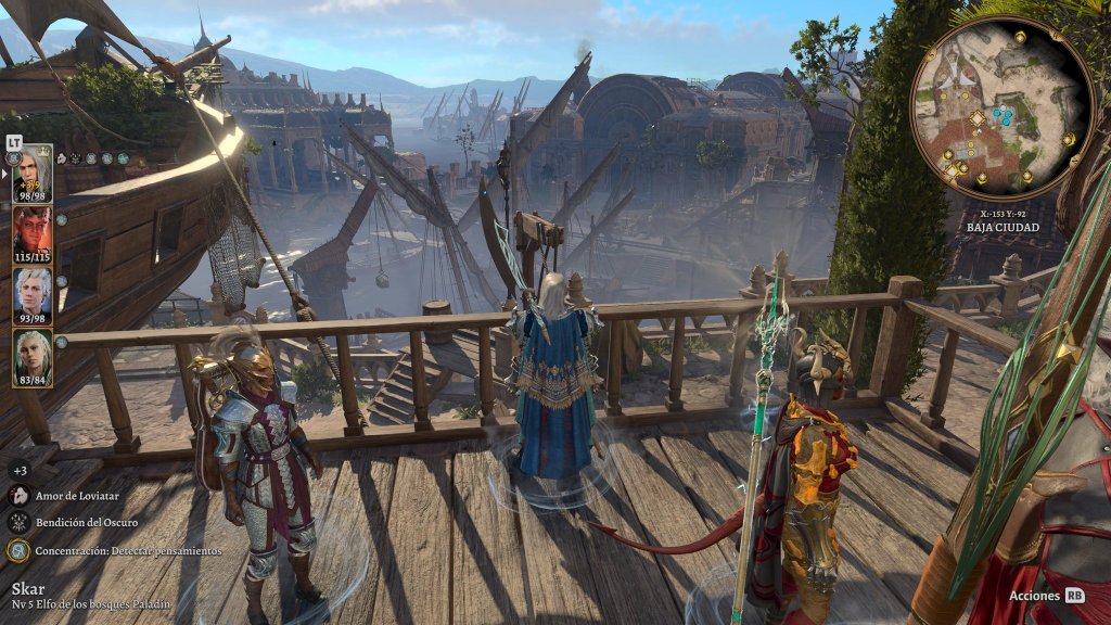 Ahora, todo es distinto. Porque nunca antes habíamos visitado Puerta de Baldur como sí lo hacemos en esta tercera entrega. Para conseguir todo esto, había que ampliar la escala y hacer saltar por los aires cualquier limitación posible. Y lo que se ha conseguido parece cosa de brujos. No hablamos de una ciudad grande -que lo es-, sino de una densidad de detalles que deja en ridículo no solo las anteriores entregas, sino a casi cualquier otro RPG moderno. Y aunque todo esto pueda sonar a palabrería vacía, cualquier miramiento de incredulidad queda sepultado cuando eres capaz de llegar a la cima de un palacio apilando cajas y cajas a modo de escalera. Todo es posible. Incluso volar hacia los tejados de los edificios para descubrir, incluso ahí, algún objeto interesante que está relacionado con una misión.