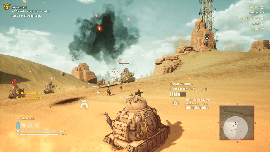 En cuanto a la sensación al volante, es bastante satisfactoria. El movimiento constante en los combates los hace muy dinámicos. Asimismo, el sistema de disparo conduciendo es divertido y sencillo de dominar. Teniendo en cuenta que estamos en un RPG, la dificultad es siempre relativa al equipamiento y nivel. Por suerte, no me he topado en ningún momento con muros que me forzasen a subir de nivel para seguir. Todo está bastante bien medido para disfrutar del juego a nuestro ritmo.