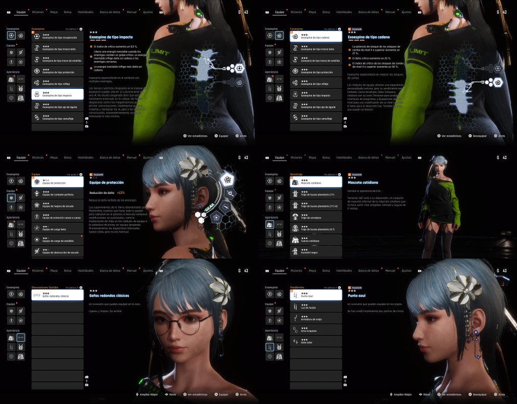 Además de la exoespina y el equipo, como parte de la customización, podemos hacer que EVE luzca gafas y pendientes.