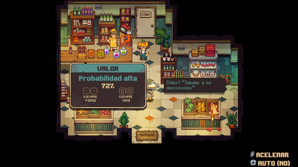 Por otro lado, cuando hablemos con cualquier personaje podremos decidir cómo contestarles. Esto ocurre igualmente a la hora de realizar distintas acciones como abrir cofres. Cada acción o decisión, dependerá de nuestro nivel de carisma, inteligencia, valor y aptitud que iremos mejorando poco a poco. Por ejemplo, para poder mejorar la inteligencia tendremos que realizar crucigramas y para mejorar el valor tendremos que ir a los baños termales del pueblo. Nuestros parámetros no empezarán desde 0 ya que al inicio del juego podremos elegir que parámetro queremos tener más desarrollado, sabiendo que habrá personajes desde el principio que pueden tener objetos que necesitamos y que solo podremos conseguir si hemos hecho bien el reparto de puntos.