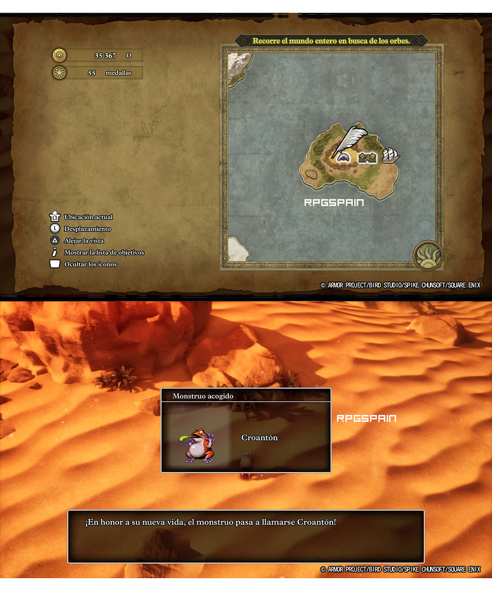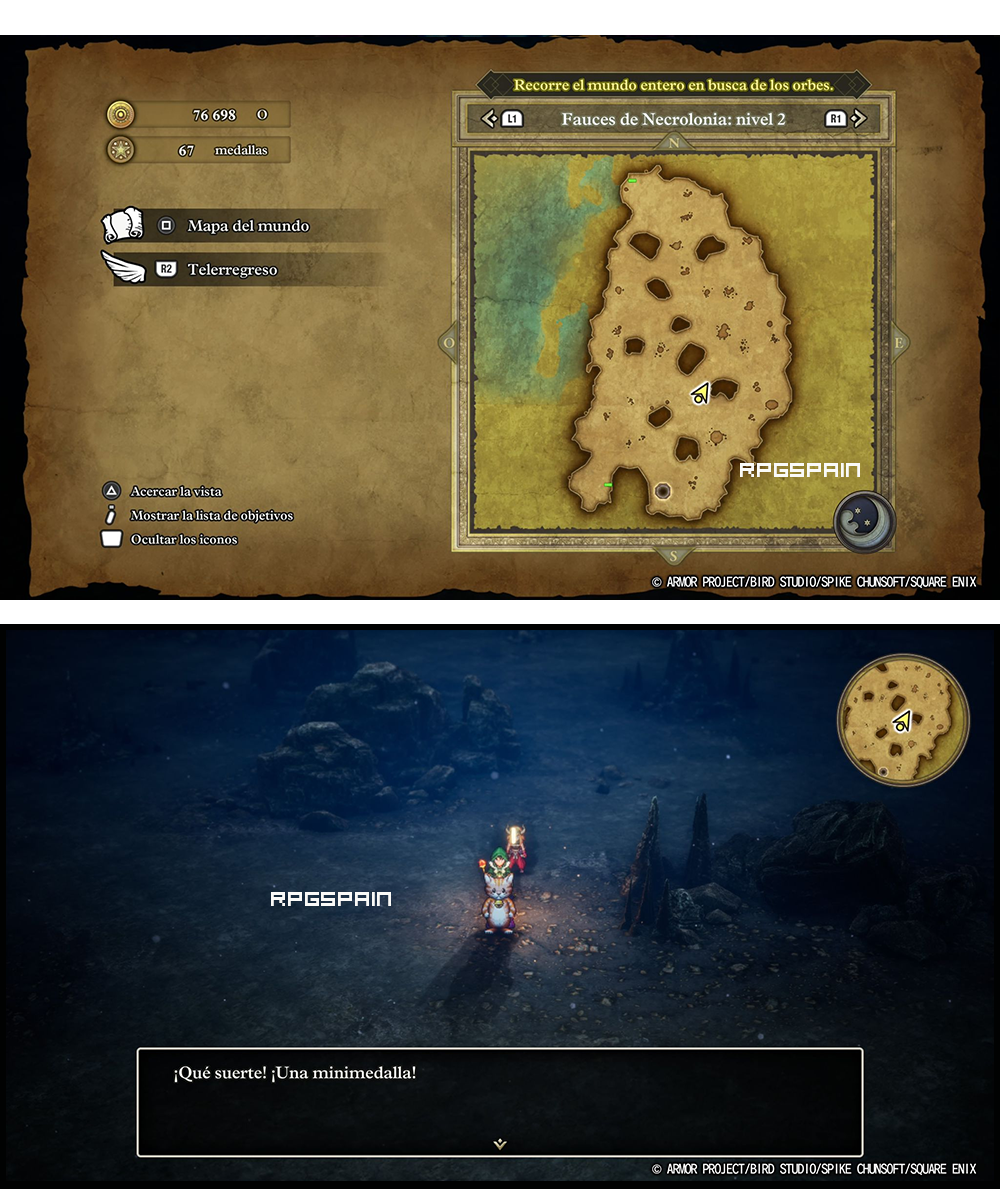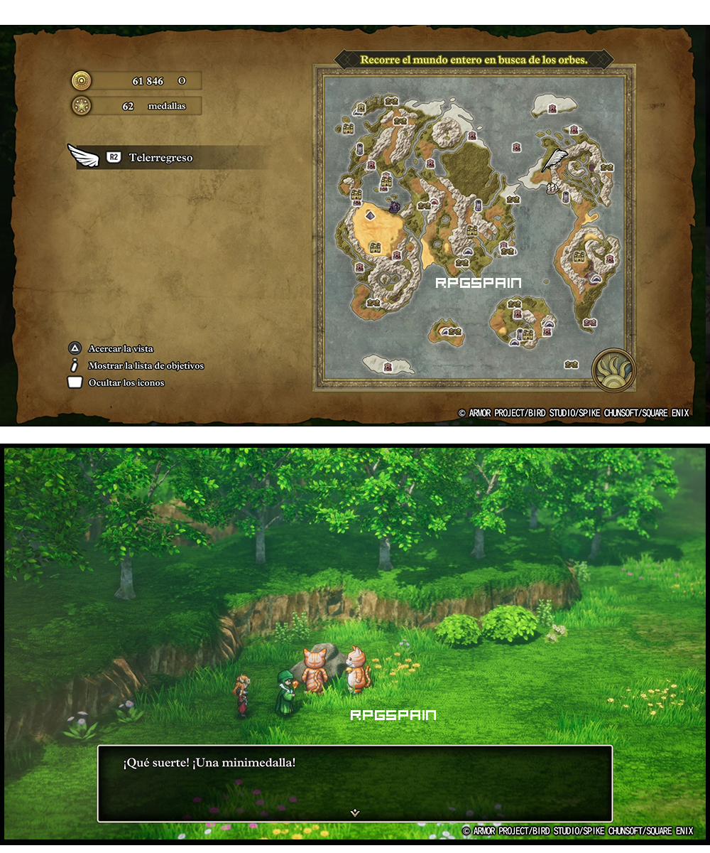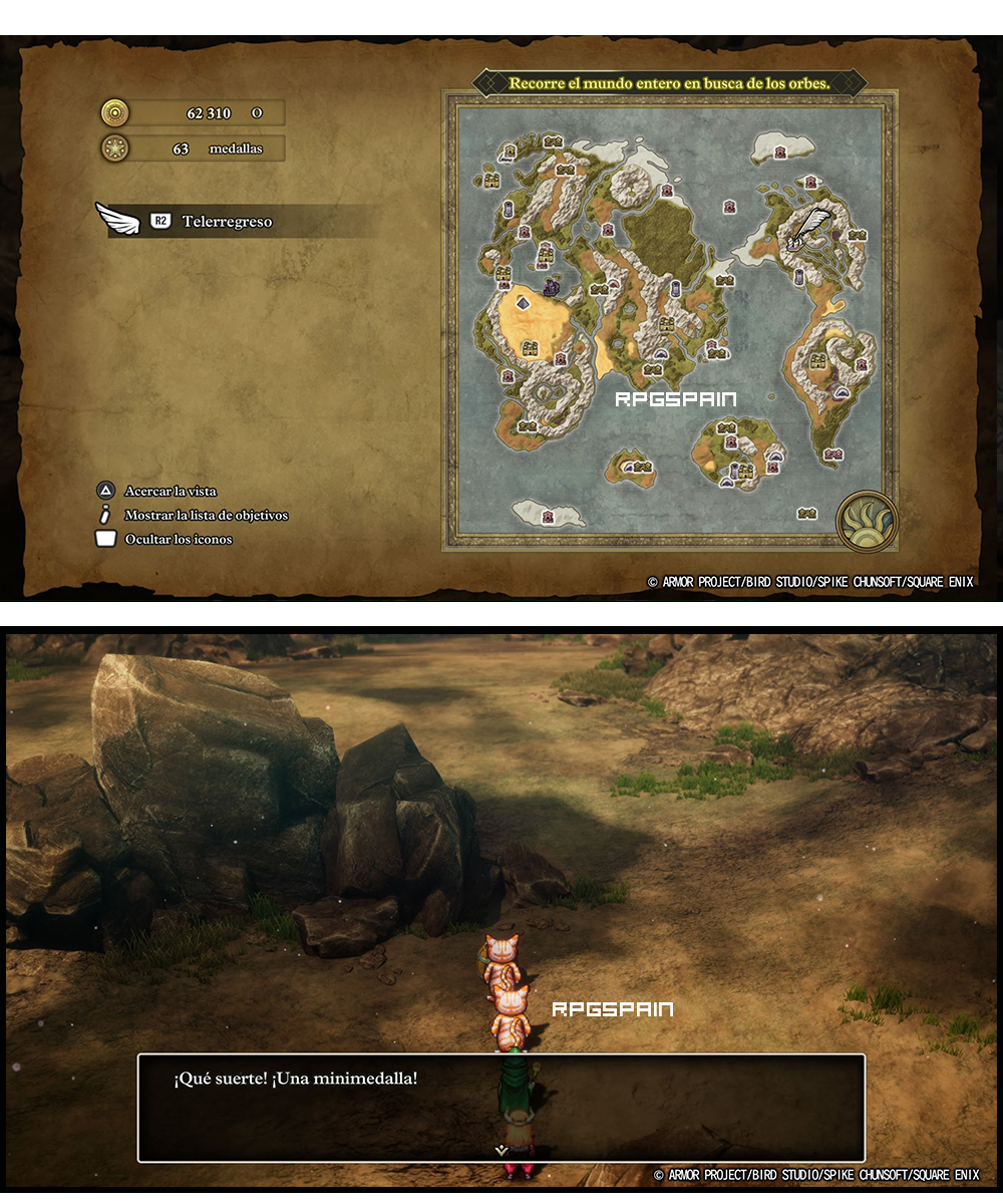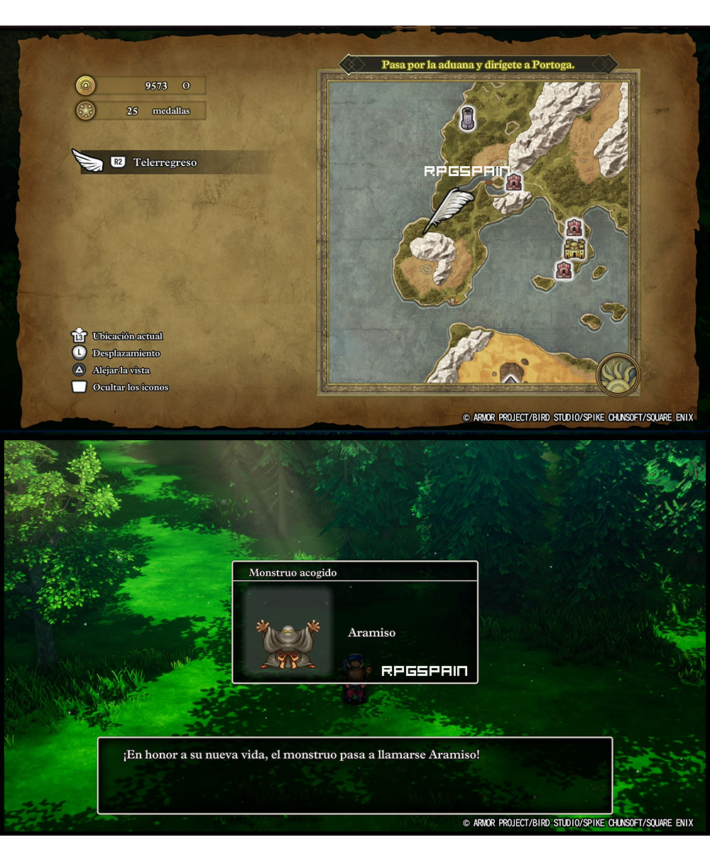 Al principio del juego podremos elegir que vocación llevar con los 3 personajes que se unirán a nuestro equipo. Uno debe ser si o si doma bestias y los otros dos estarán bajo vuestro propio criterio. Recomiendo un ladrón y un mago para empezar pero también es muy buena opción llevar un sacerdote y un mago (de hecho fue el equipo que use yo desde el inicio porque aunque el/la protagonista cura, no lo hace igual que un sacerdote. La curva de dificultad también es mayor al inicio y el doma bestias empieza a hacer daño a partir de nivel 20). El juego se puede jugar en el orden que queramos pero yo voy a poner en esta guía la manera que considero más adecuada y la que mejor me funcionó. En los trofeos de historia explicaré como ir avanzando. Asegúrate de mirar todos los puntos brillantes del mapamundi y buscar todos los objetos que hay en las ciudades ya que si no se puede volver un engorro. No uses elixires élficos bajo ningún concepto ni los vendas. Cuidado porque hay dos maneras de guardar diferentes: Una es con los curas/monjas del juego y otro es suspendiendo la aventura desde el menú. Cuando volvamos a jugar para cargar la partida habiendo elegido la primera opción, tendremos que elegir la ranura y cargar. Si hemos suspendido la aventura, tendremos que «retomar la aventura desde el último punto guardado». Parece una tontería pero hasta que lo entendí, llegué a perder mini medallas porque no cargué la partida correctamente. Te dejo un pequeño mapa de referencia para que te sea más fácil investigar el primer tramo del juego. El segundo no lo veo tan necesario y puede contener spoilers por lo que irá apareciendo en la guía de monstruos dóciles y mini medallas: |