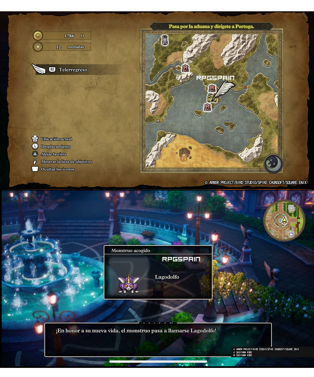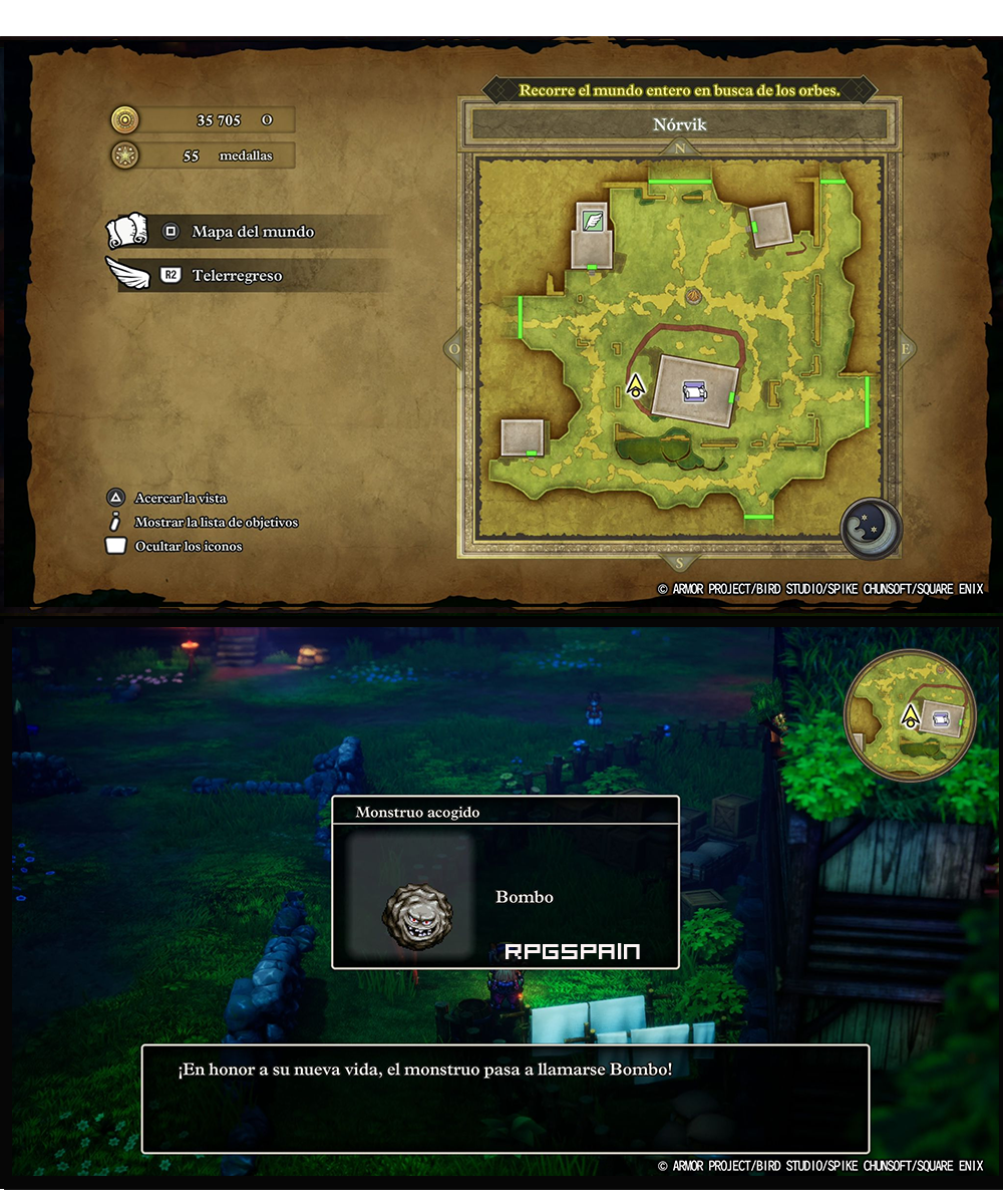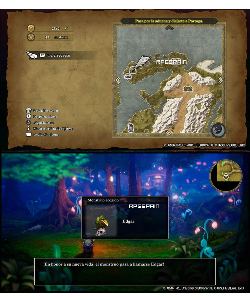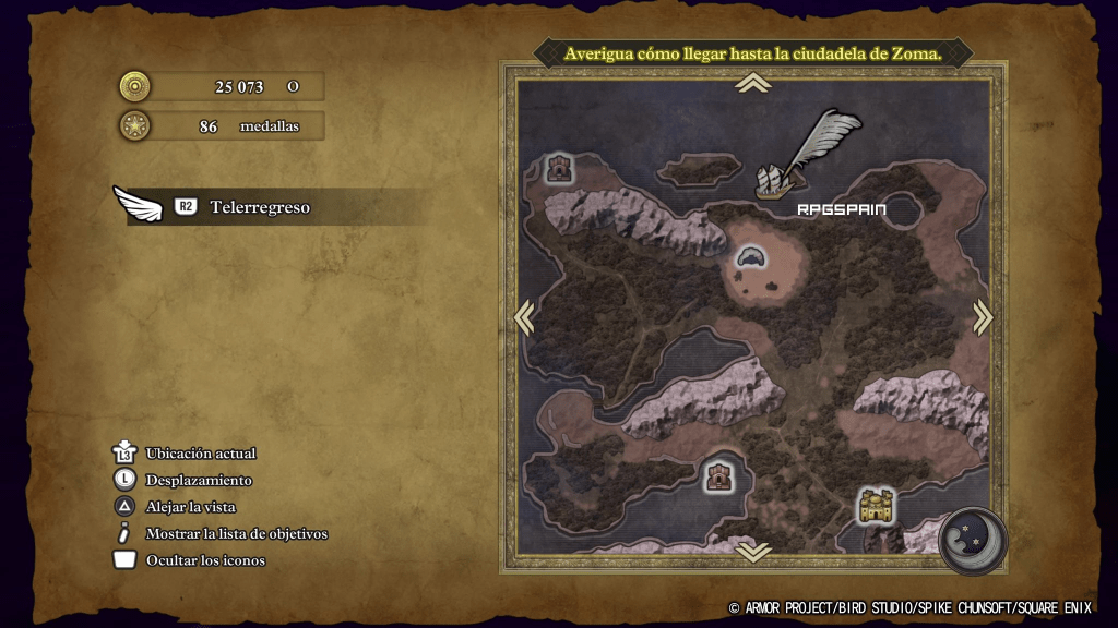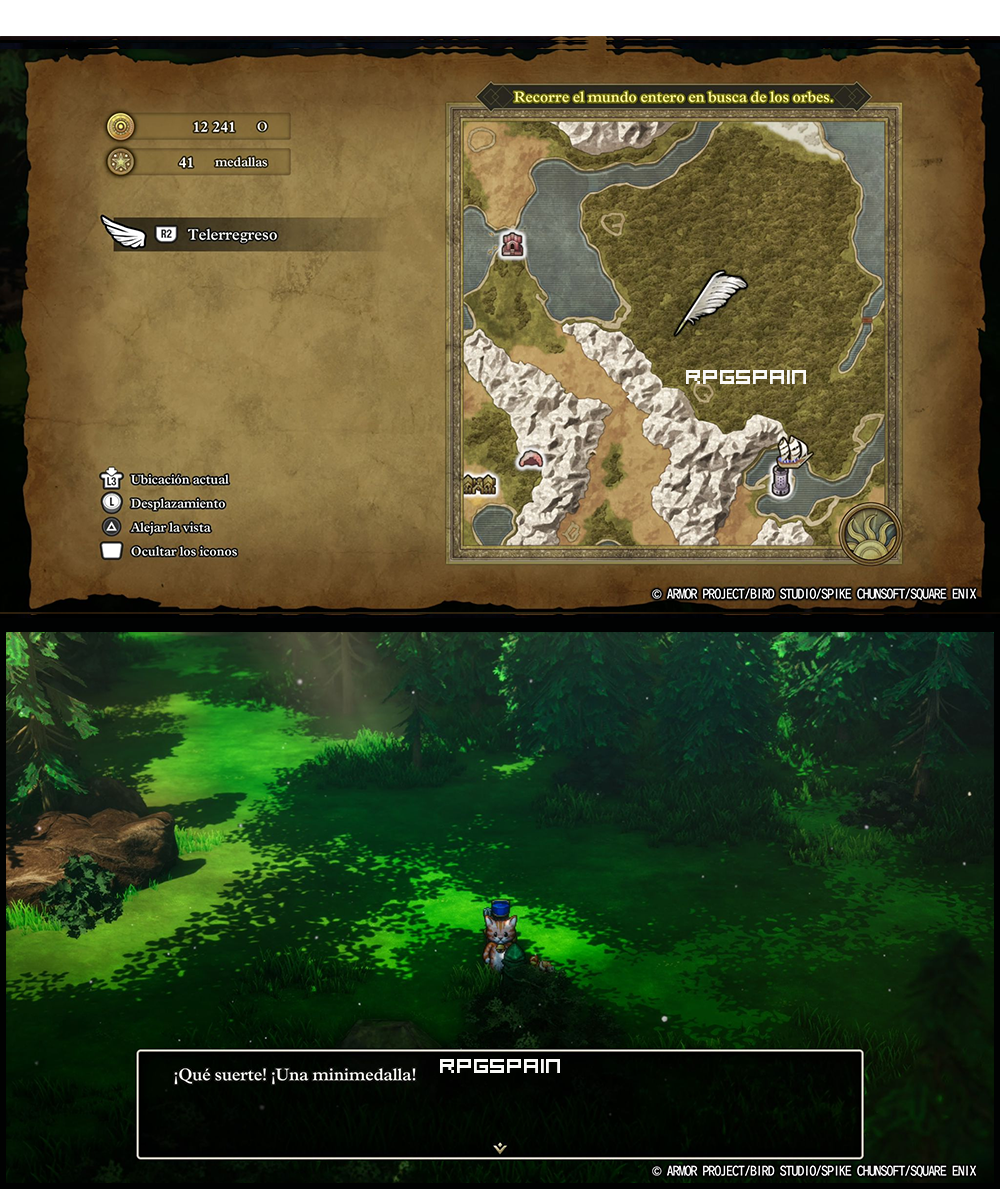 Al principio del juego podremos elegir que vocación llevar con los 3 personajes que se unirán a nuestro equipo. Uno debe ser si o si doma bestias y los otros dos estarán bajo vuestro propio criterio. Recomiendo un ladrón y un mago para empezar pero también es muy buena opción llevar un sacerdote y un mago (de hecho fue el equipo que use yo desde el inicio porque aunque el/la protagonista cura, no lo hace igual que un sacerdote. La curva de dificultad también es mayor al inicio y el doma bestias empieza a hacer daño a partir de nivel 20). El juego se puede jugar en el orden que queramos pero yo voy a poner en esta guía la manera que considero más adecuada y la que mejor me funcionó. En los trofeos de historia explicaré como ir avanzando. Asegúrate de mirar todos los puntos brillantes del mapamundi y buscar todos los objetos que hay en las ciudades ya que si no se puede volver un engorro. No uses elixires élficos bajo ningún concepto ni los vendas. Cuidado porque hay dos maneras de guardar diferentes: Una es con los curas/monjas del juego y otro es suspendiendo la aventura desde el menú. Cuando volvamos a jugar para cargar la partida habiendo elegido la primera opción, tendremos que elegir la ranura y cargar. Si hemos suspendido la aventura, tendremos que «retomar la aventura desde el último punto guardado». Parece una tontería pero hasta que lo entendí, llegué a perder mini medallas porque no cargué la partida correctamente. Te dejo un pequeño mapa de referencia para que te sea más fácil investigar el primer tramo del juego. El segundo no lo veo tan necesario y puede contener spoilers por lo que irá apareciendo en la guía de monstruos dóciles y mini medallas: |
