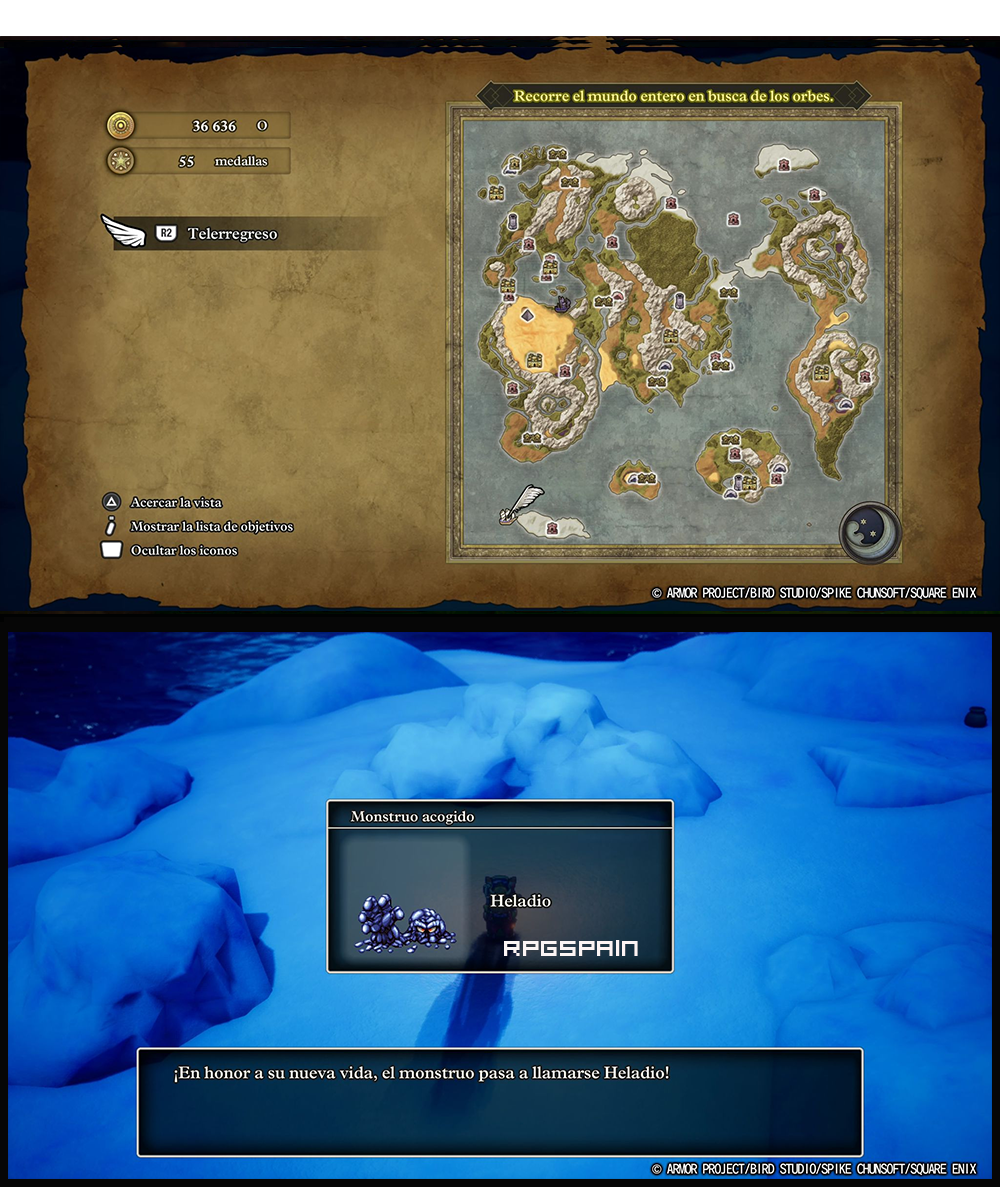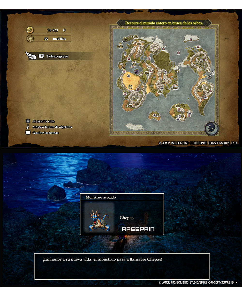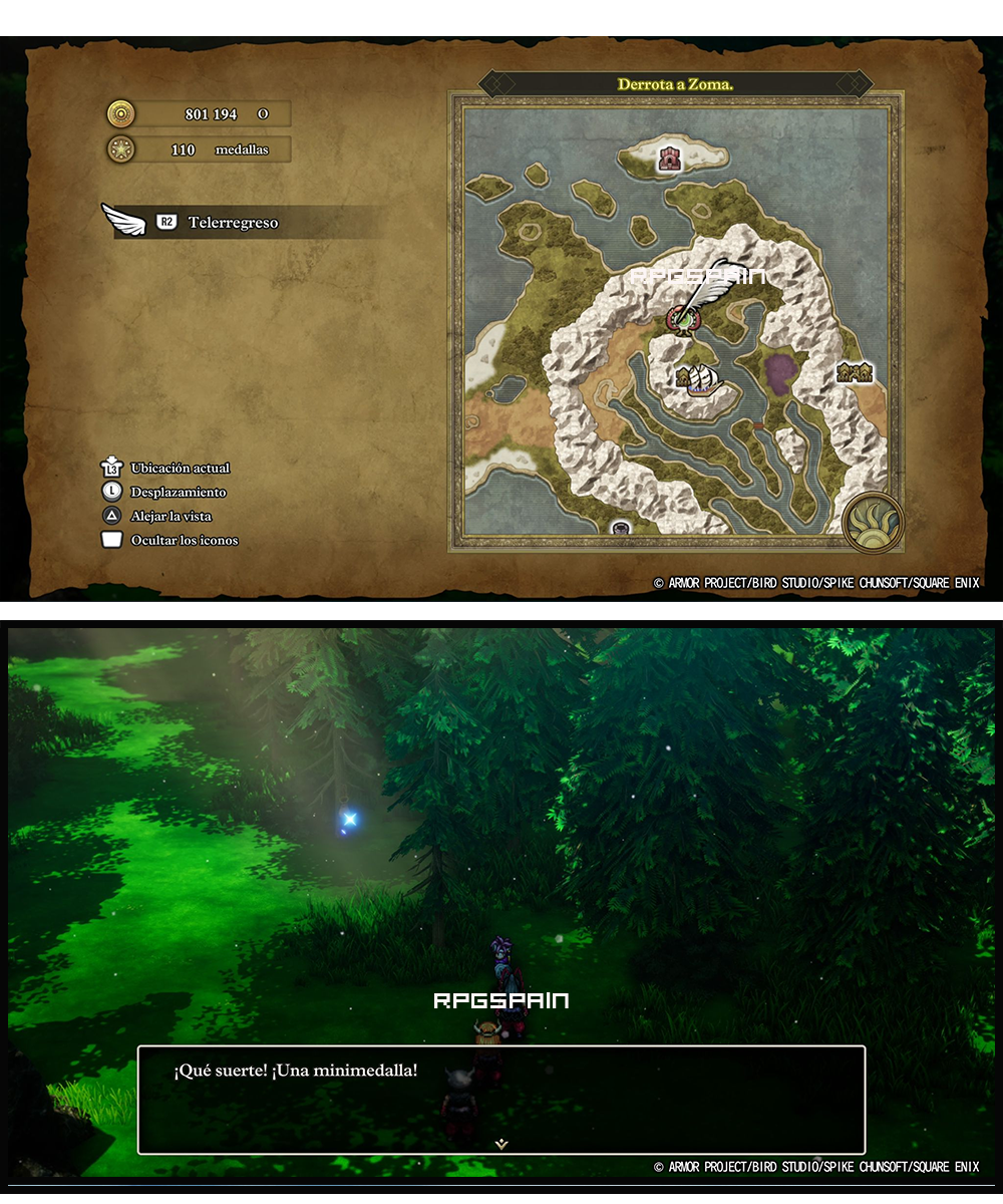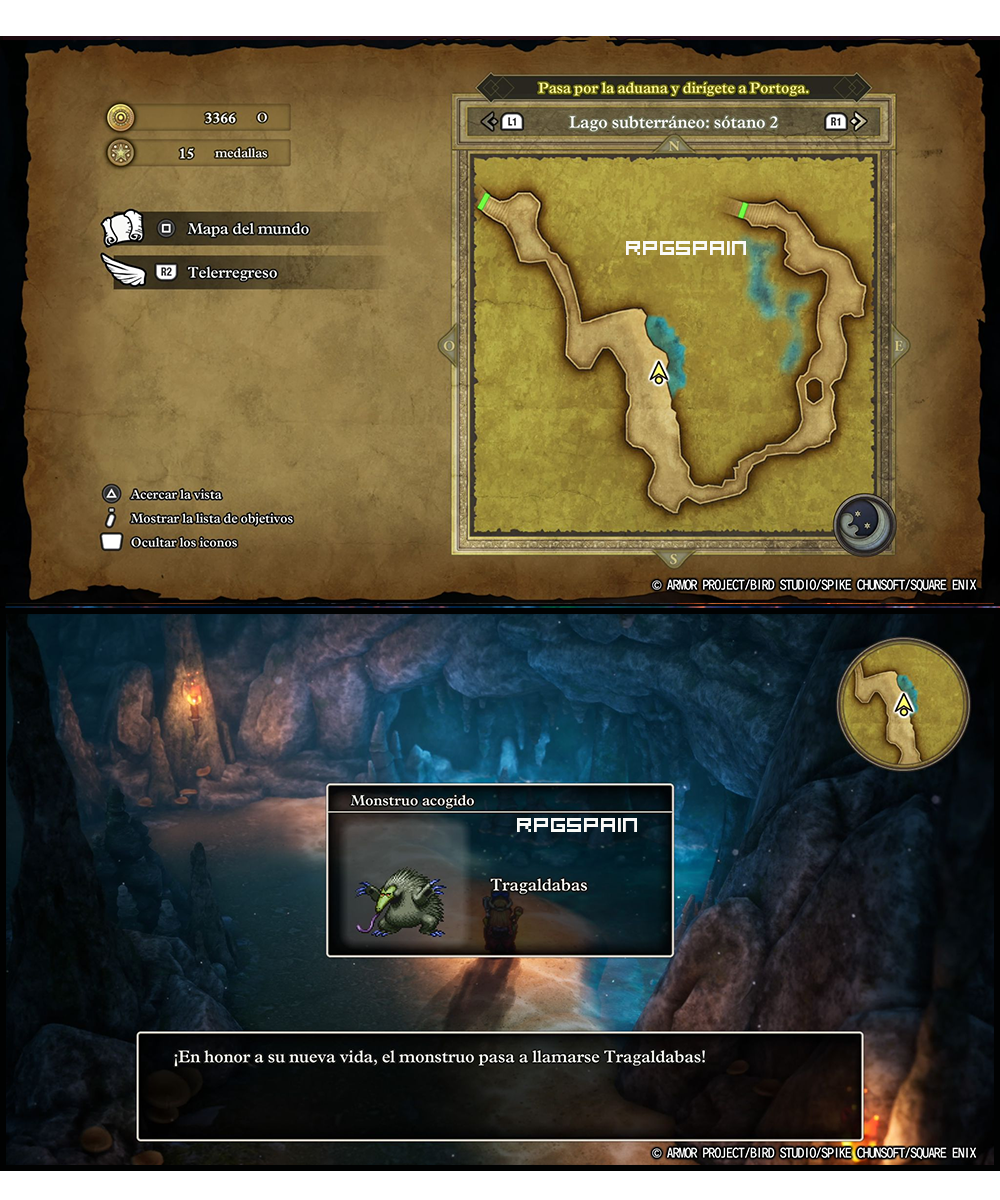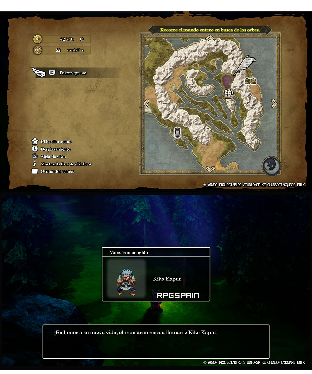 Al principio del juego podremos elegir que vocación llevar con los 3 personajes que se unirán a nuestro equipo. Uno debe ser si o si doma bestias y los otros dos estarán bajo vuestro propio criterio. Recomiendo un ladrón y un mago para empezar pero también es muy buena opción llevar un sacerdote y un mago (de hecho fue el equipo que use yo desde el inicio porque aunque el/la protagonista cura, no lo hace igual que un sacerdote. La curva de dificultad también es mayor al inicio y el doma bestias empieza a hacer daño a partir de nivel 20). El juego se puede jugar en el orden que queramos pero yo voy a poner en esta guía la manera que considero más adecuada y la que mejor me funcionó. En los trofeos de historia explicaré como ir avanzando. Asegúrate de mirar todos los puntos brillantes del mapamundi y buscar todos los objetos que hay en las ciudades ya que si no se puede volver un engorro. No uses elixires élficos bajo ningún concepto ni los vendas. Cuidado porque hay dos maneras de guardar diferentes: Una es con los curas/monjas del juego y otro es suspendiendo la aventura desde el menú. Cuando volvamos a jugar para cargar la partida habiendo elegido la primera opción, tendremos que elegir la ranura y cargar. Si hemos suspendido la aventura, tendremos que «retomar la aventura desde el último punto guardado». Parece una tontería pero hasta que lo entendí, llegué a perder mini medallas porque no cargué la partida correctamente. Te dejo un pequeño mapa de referencia para que te sea más fácil investigar el primer tramo del juego. El segundo no lo veo tan necesario y puede contener spoilers por lo que irá apareciendo en la guía de monstruos dóciles y mini medallas: |
