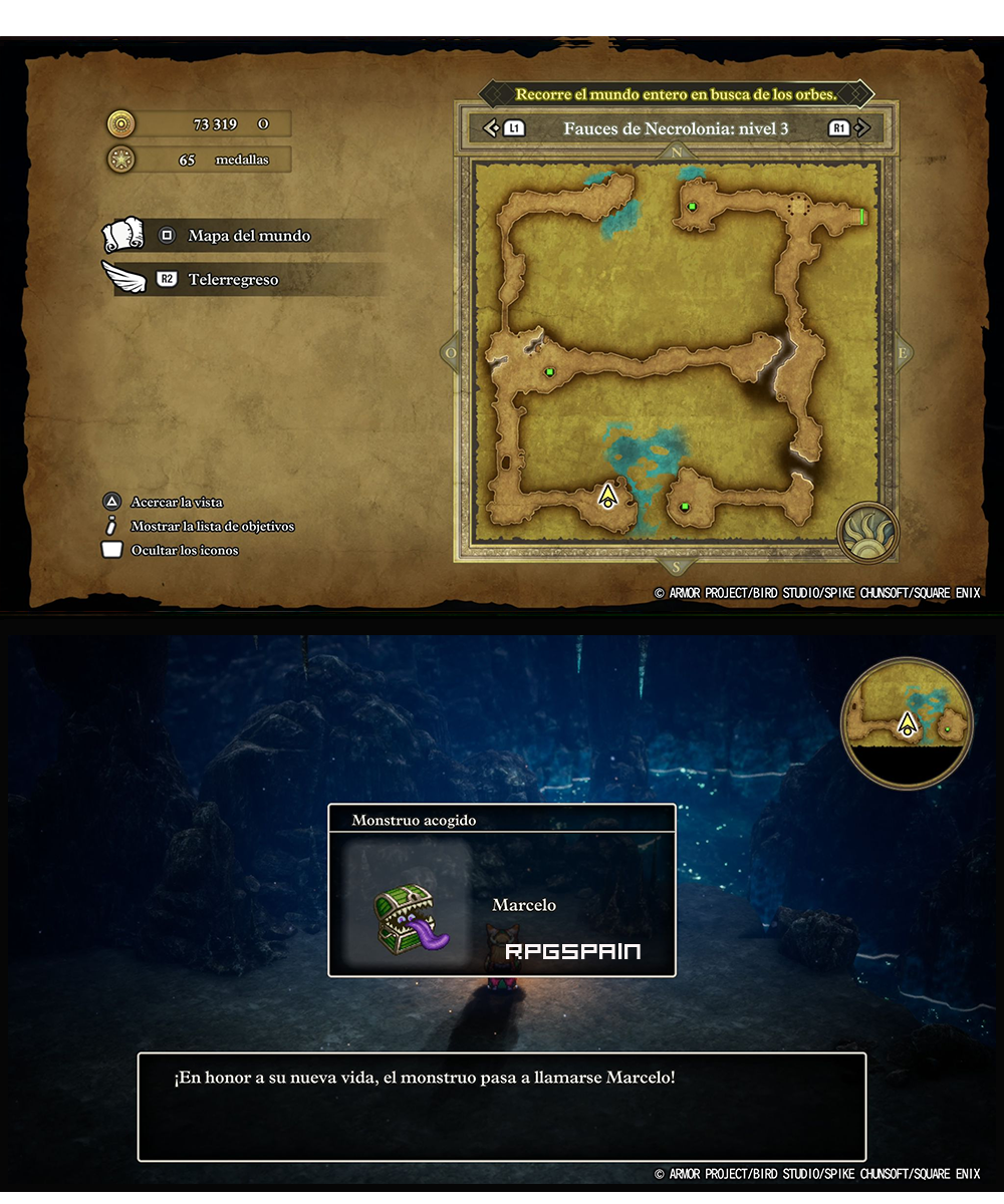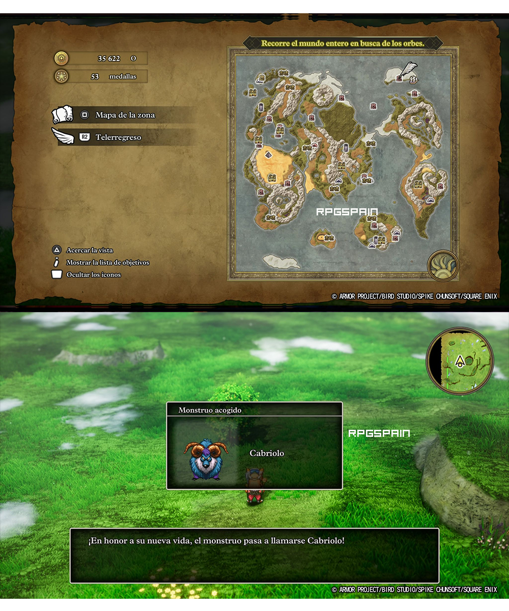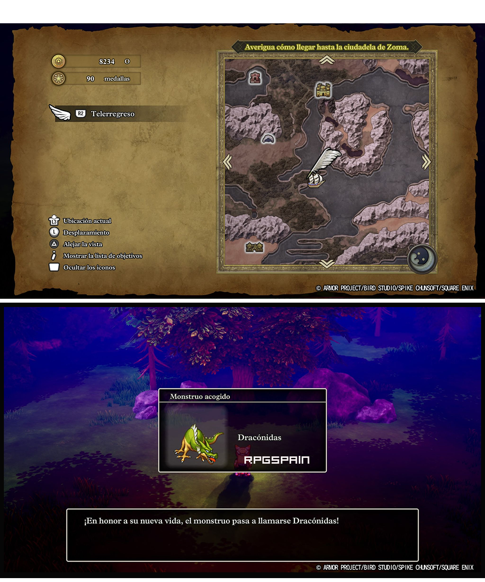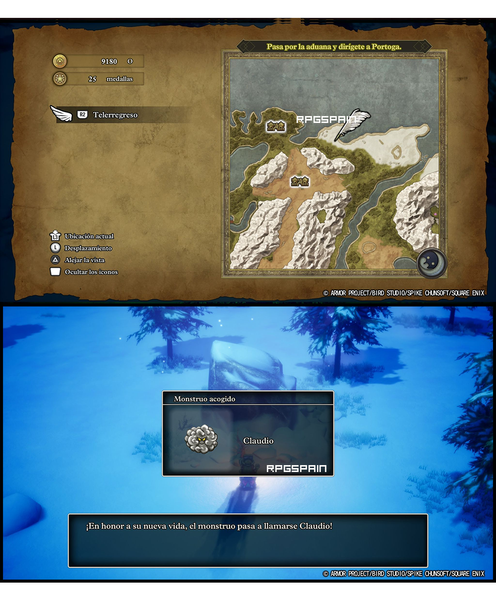 Al principio del juego podremos elegir que vocación llevar con los 3 personajes que se unirán a nuestro equipo. Uno debe ser si o si doma bestias y los otros dos estarán bajo vuestro propio criterio. Recomiendo un ladrón y un mago para empezar pero también es muy buena opción llevar un sacerdote y un mago (de hecho fue el equipo que use yo desde el inicio porque aunque el/la protagonista cura, no lo hace igual que un sacerdote. La curva de dificultad también es mayor al inicio y el doma bestias empieza a hacer daño a partir de nivel 20). El juego se puede jugar en el orden que queramos pero yo voy a poner en esta guía la manera que considero más adecuada y la que mejor me funcionó. En los trofeos de historia explicaré como ir avanzando. Asegúrate de mirar todos los puntos brillantes del mapamundi y buscar todos los objetos que hay en las ciudades ya que si no se puede volver un engorro. No uses elixires élficos bajo ningún concepto ni los vendas. Cuidado porque hay dos maneras de guardar diferentes: Una es con los curas/monjas del juego y otro es suspendiendo la aventura desde el menú. Cuando volvamos a jugar para cargar la partida habiendo elegido la primera opción, tendremos que elegir la ranura y cargar. Si hemos suspendido la aventura, tendremos que «retomar la aventura desde el último punto guardado». Parece una tontería pero hasta que lo entendí, llegué a perder mini medallas porque no cargué la partida correctamente. Te dejo un pequeño mapa de referencia para que te sea más fácil investigar el primer tramo del juego. El segundo no lo veo tan necesario y puede contener spoilers por lo que irá apareciendo en la guía de monstruos dóciles y mini medallas: |