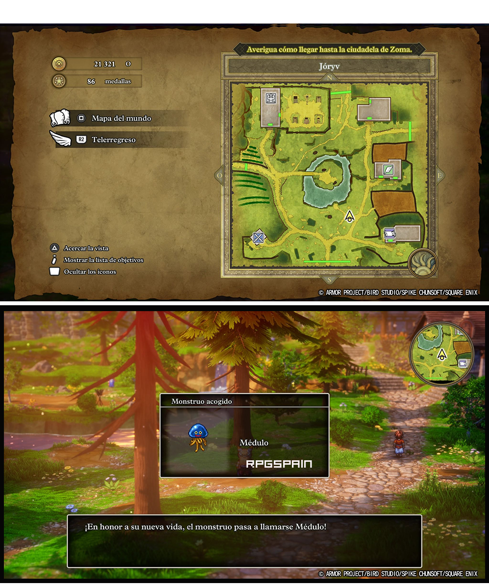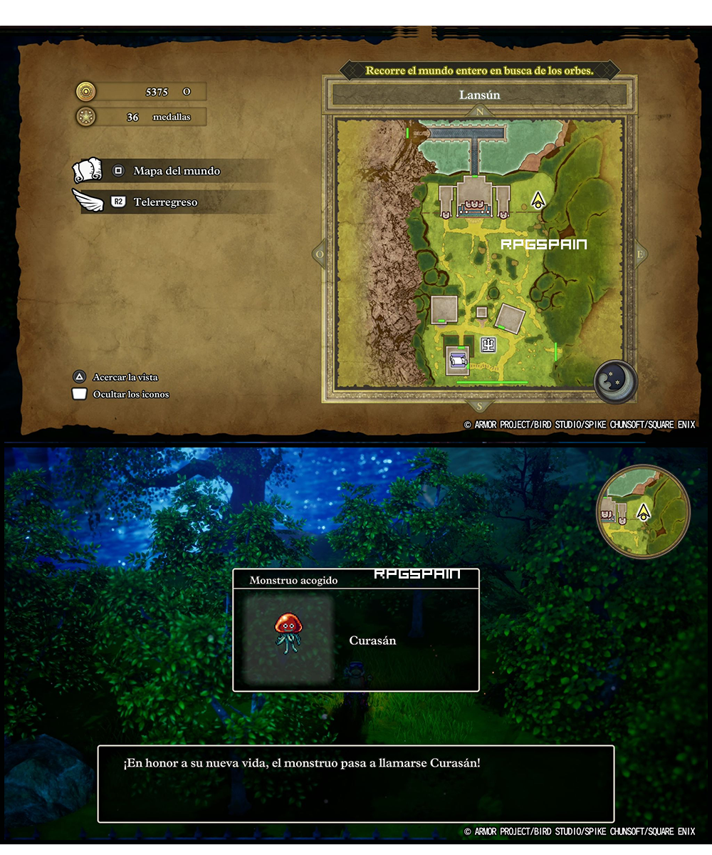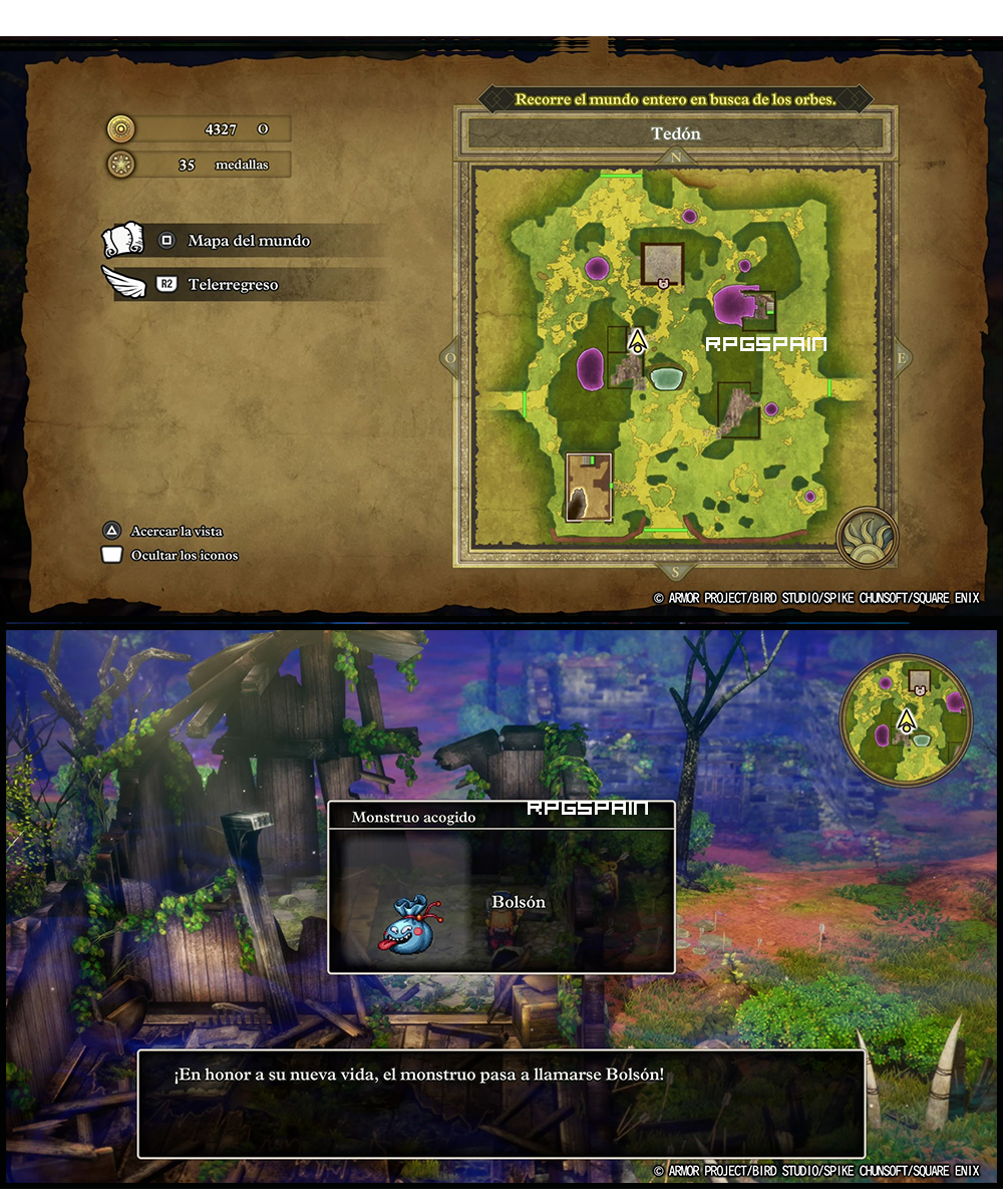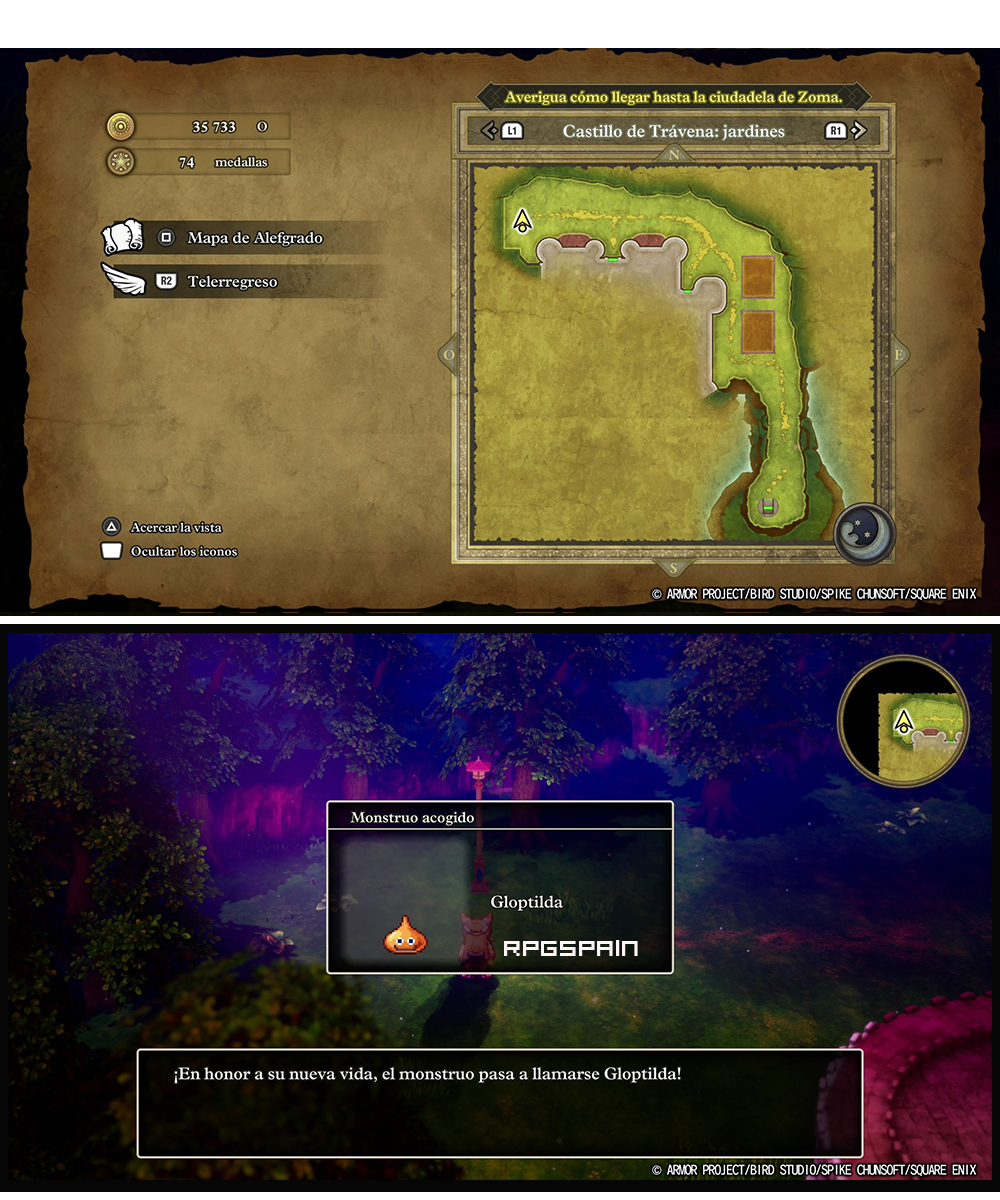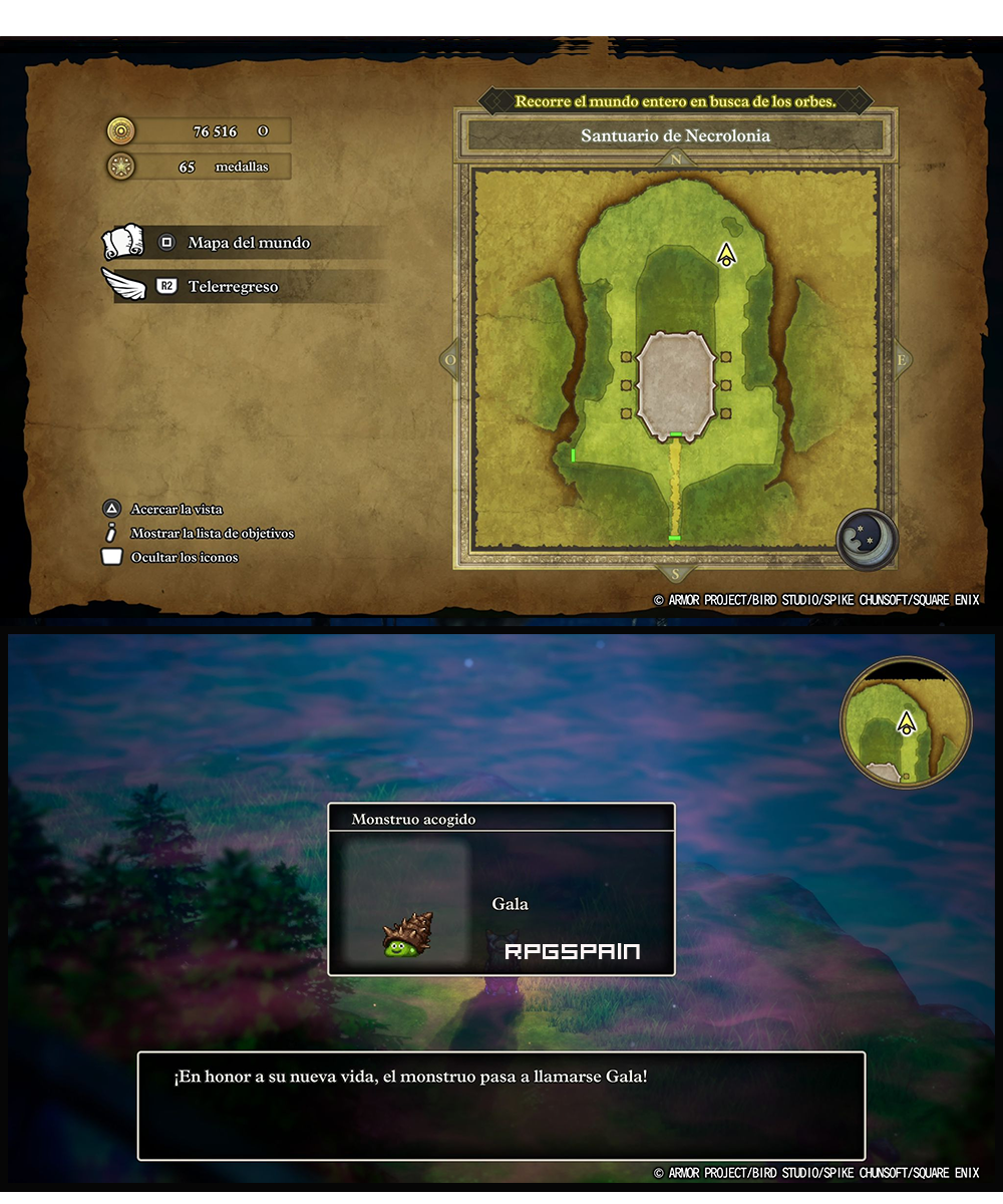 Al principio del juego podremos elegir que vocación llevar con los 3 personajes que se unirán a nuestro equipo. Uno debe ser si o si doma bestias y los otros dos estarán bajo vuestro propio criterio. Recomiendo un ladrón y un mago para empezar pero también es muy buena opción llevar un sacerdote y un mago (de hecho fue el equipo que use yo desde el inicio porque aunque el/la protagonista cura, no lo hace igual que un sacerdote. La curva de dificultad también es mayor al inicio y el doma bestias empieza a hacer daño a partir de nivel 20). El juego se puede jugar en el orden que queramos pero yo voy a poner en esta guía la manera que considero más adecuada y la que mejor me funcionó. En los trofeos de historia explicaré como ir avanzando. Asegúrate de mirar todos los puntos brillantes del mapamundi y buscar todos los objetos que hay en las ciudades ya que si no se puede volver un engorro. No uses elixires élficos bajo ningún concepto ni los vendas. Cuidado porque hay dos maneras de guardar diferentes: Una es con los curas/monjas del juego y otro es suspendiendo la aventura desde el menú. Cuando volvamos a jugar para cargar la partida habiendo elegido la primera opción, tendremos que elegir la ranura y cargar. Si hemos suspendido la aventura, tendremos que «retomar la aventura desde el último punto guardado». Parece una tontería pero hasta que lo entendí, llegué a perder mini medallas porque no cargué la partida correctamente. Te dejo un pequeño mapa de referencia para que te sea más fácil investigar el primer tramo del juego. El segundo no lo veo tan necesario y puede contener spoilers por lo que irá apareciendo en la guía de monstruos dóciles y mini medallas: |
