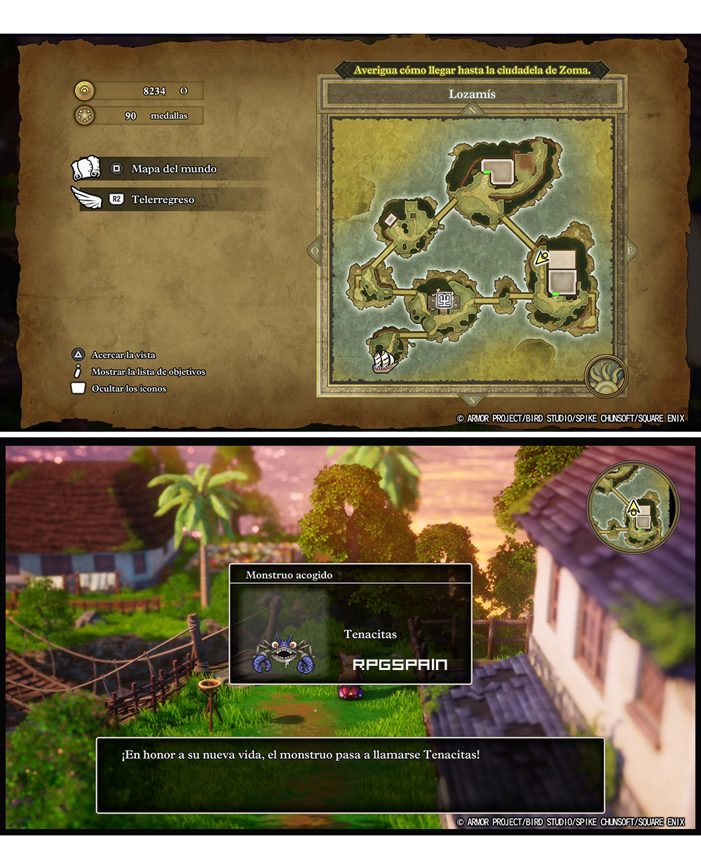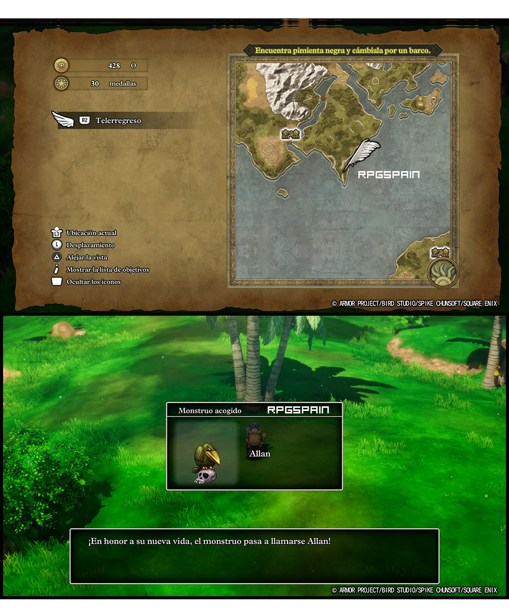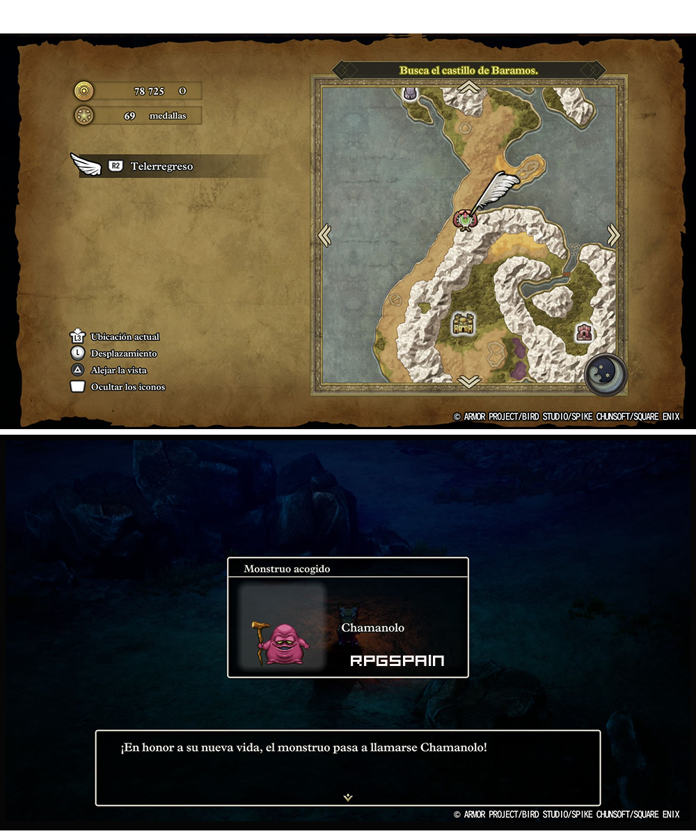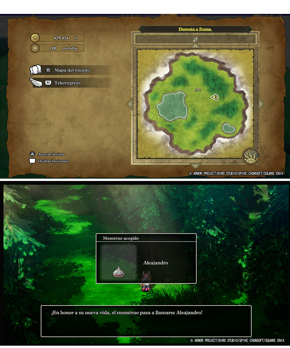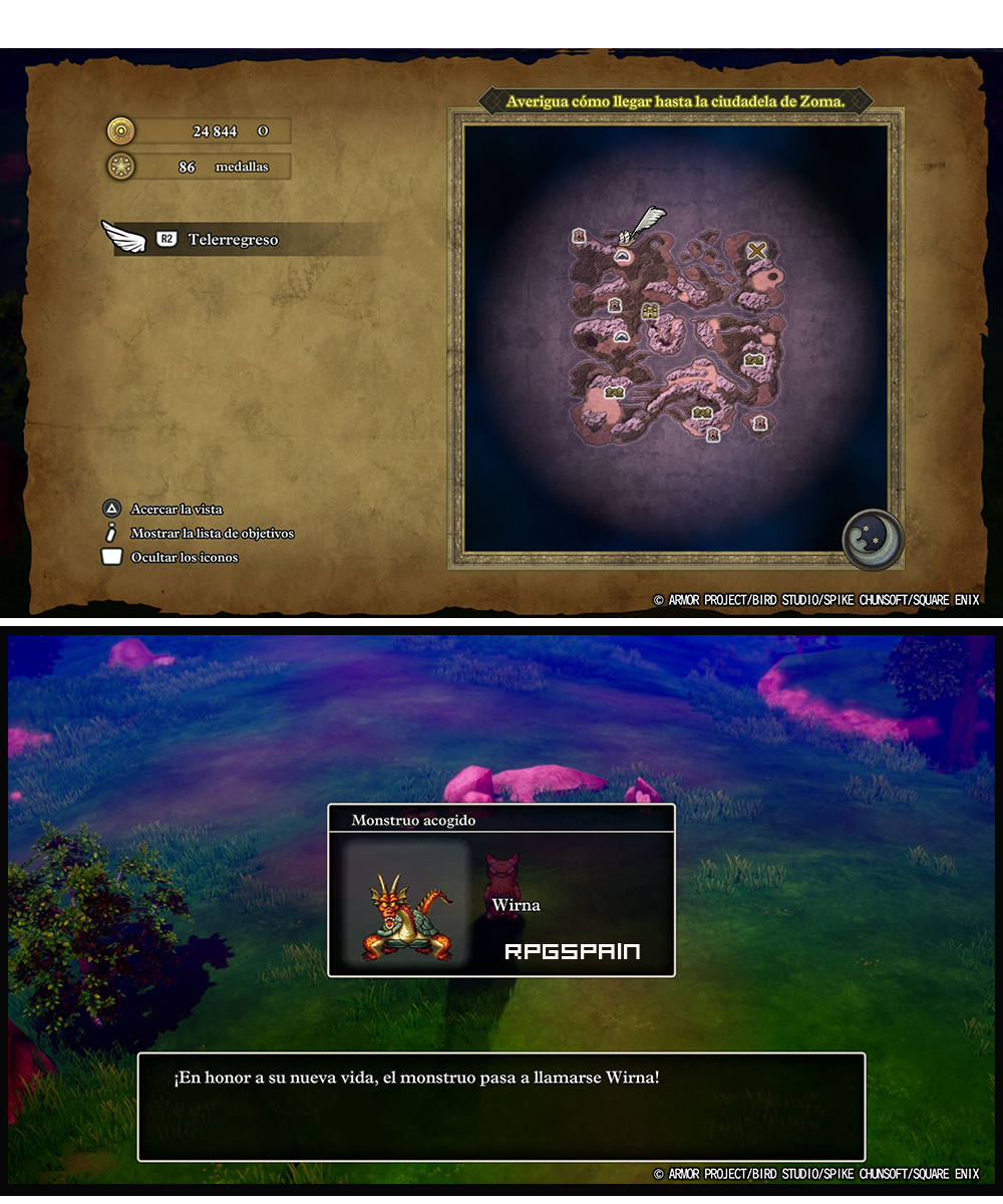 Al principio del juego podremos elegir que vocación llevar con los 3 personajes que se unirán a nuestro equipo. Uno debe ser si o si doma bestias y los otros dos estarán bajo vuestro propio criterio. Recomiendo un ladrón y un mago para empezar pero también es muy buena opción llevar un sacerdote y un mago (de hecho fue el equipo que use yo desde el inicio porque aunque el/la protagonista cura, no lo hace igual que un sacerdote. La curva de dificultad también es mayor al inicio y el doma bestias empieza a hacer daño a partir de nivel 20). El juego se puede jugar en el orden que queramos pero yo voy a poner en esta guía la manera que considero más adecuada y la que mejor me funcionó. En los trofeos de historia explicaré como ir avanzando. Asegúrate de mirar todos los puntos brillantes del mapamundi y buscar todos los objetos que hay en las ciudades ya que si no se puede volver un engorro. No uses elixires élficos bajo ningún concepto ni los vendas. Cuidado porque hay dos maneras de guardar diferentes: Una es con los curas/monjas del juego y otro es suspendiendo la aventura desde el menú. Cuando volvamos a jugar para cargar la partida habiendo elegido la primera opción, tendremos que elegir la ranura y cargar. Si hemos suspendido la aventura, tendremos que «retomar la aventura desde el último punto guardado». Parece una tontería pero hasta que lo entendí, llegué a perder mini medallas porque no cargué la partida correctamente. Te dejo un pequeño mapa de referencia para que te sea más fácil investigar el primer tramo del juego. El segundo no lo veo tan necesario y puede contener spoilers por lo que irá apareciendo en la guía de monstruos dóciles y mini medallas: |