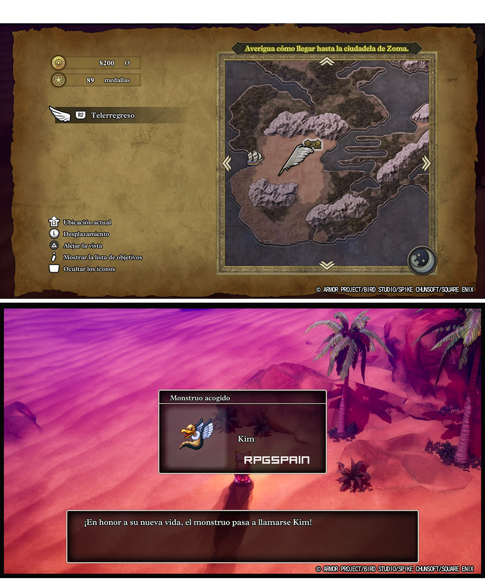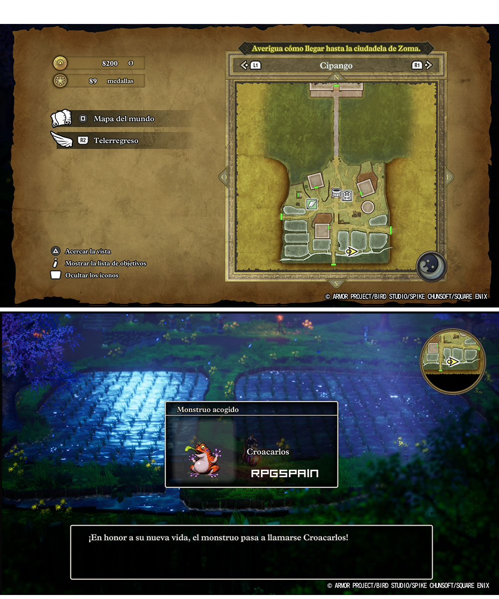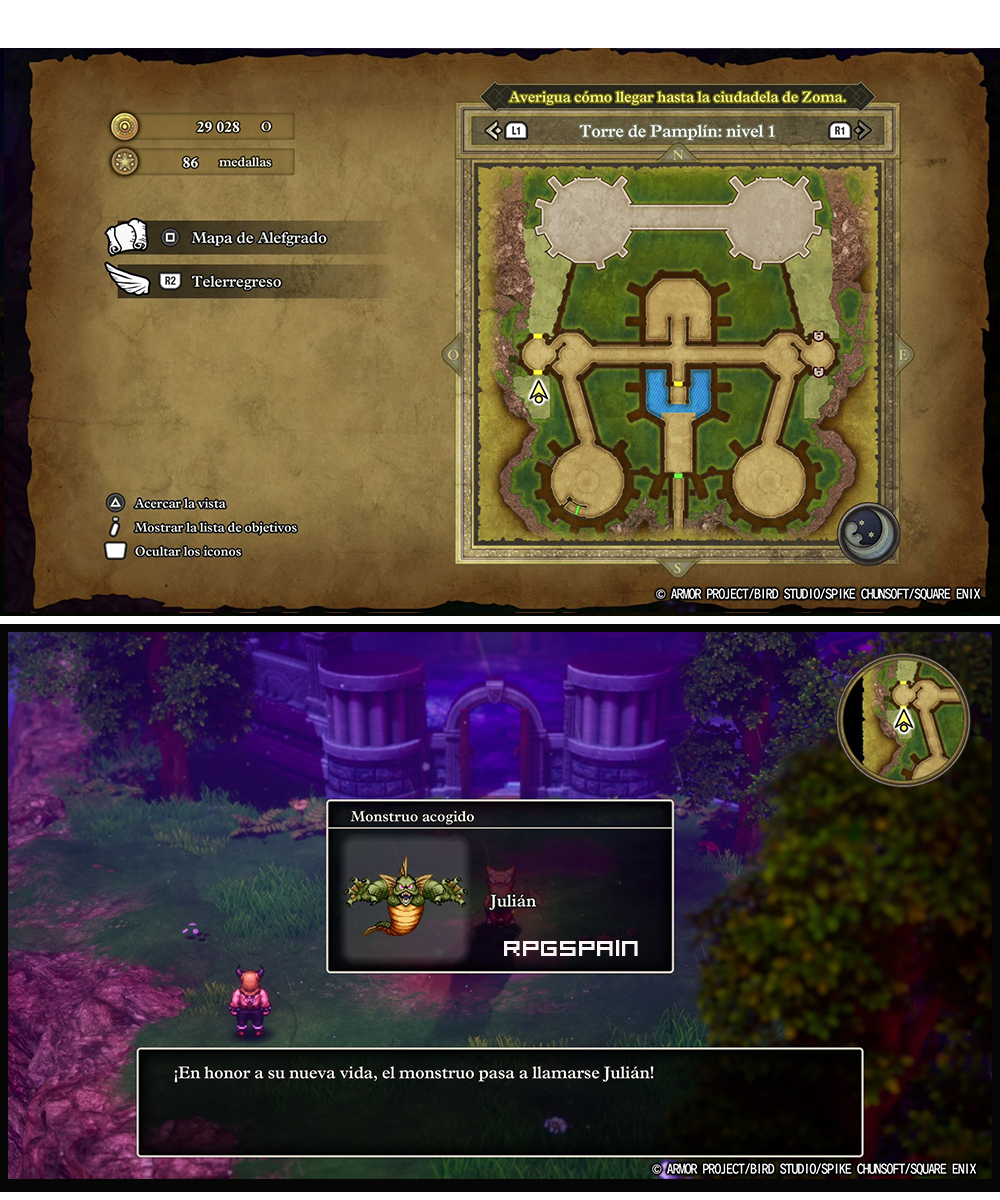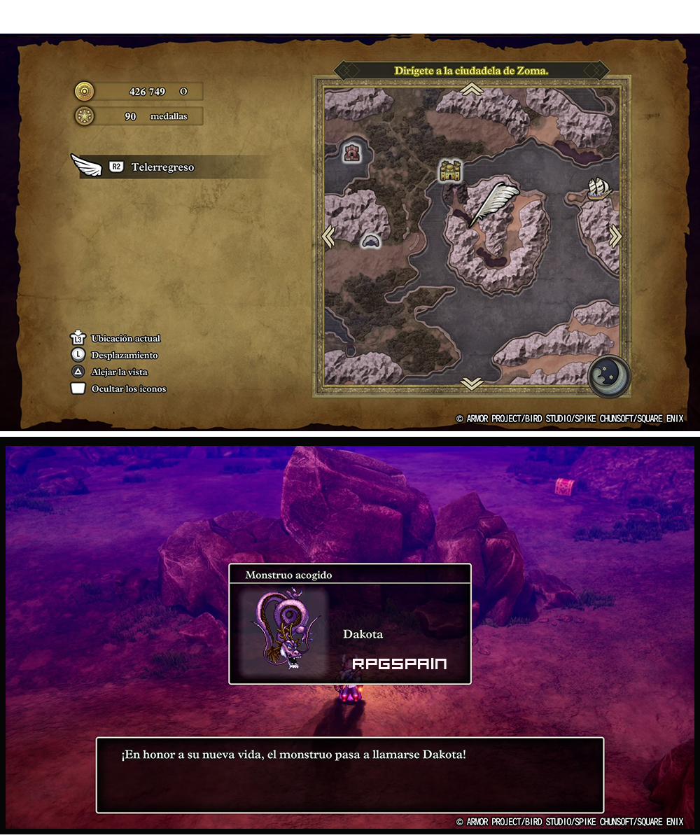 Al principio del juego podremos elegir que vocación llevar con los 3 personajes que se unirán a nuestro equipo. Uno debe ser si o si doma bestias y los otros dos estarán bajo vuestro propio criterio. Recomiendo un ladrón y un mago para empezar pero también es muy buena opción llevar un sacerdote y un mago (de hecho fue el equipo que use yo desde el inicio porque aunque el/la protagonista cura, no lo hace igual que un sacerdote. La curva de dificultad también es mayor al inicio y el doma bestias empieza a hacer daño a partir de nivel 20). El juego se puede jugar en el orden que queramos pero yo voy a poner en esta guía la manera que considero más adecuada y la que mejor me funcionó. En los trofeos de historia explicaré como ir avanzando. Asegúrate de mirar todos los puntos brillantes del mapamundi y buscar todos los objetos que hay en las ciudades ya que si no se puede volver un engorro. No uses elixires élficos bajo ningún concepto ni los vendas. Cuidado porque hay dos maneras de guardar diferentes: Una es con los curas/monjas del juego y otro es suspendiendo la aventura desde el menú. Cuando volvamos a jugar para cargar la partida habiendo elegido la primera opción, tendremos que elegir la ranura y cargar. Si hemos suspendido la aventura, tendremos que «retomar la aventura desde el último punto guardado». Parece una tontería pero hasta que lo entendí, llegué a perder mini medallas porque no cargué la partida correctamente. Te dejo un pequeño mapa de referencia para que te sea más fácil investigar el primer tramo del juego. El segundo no lo veo tan necesario y puede contener spoilers por lo que irá apareciendo en la guía de monstruos dóciles y mini medallas: |