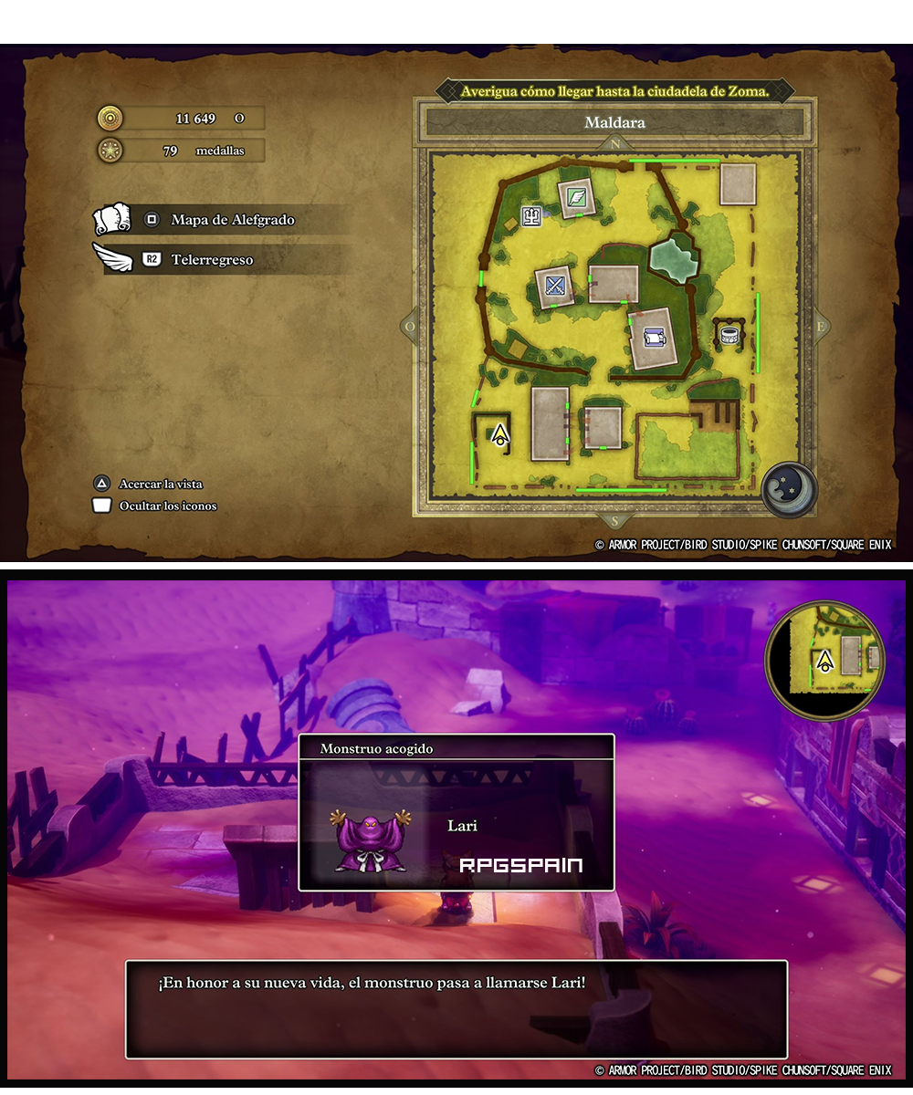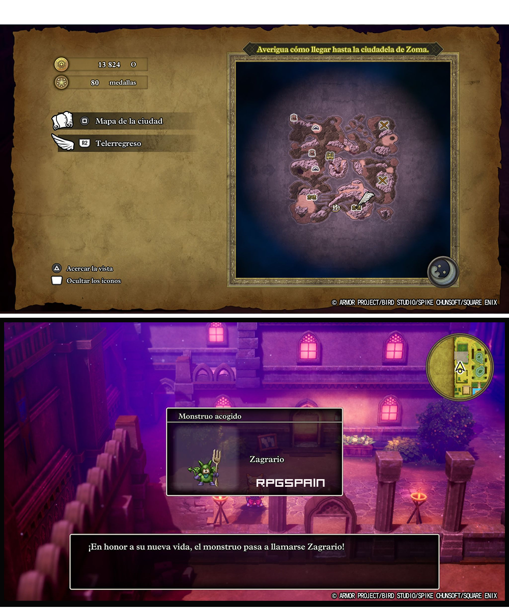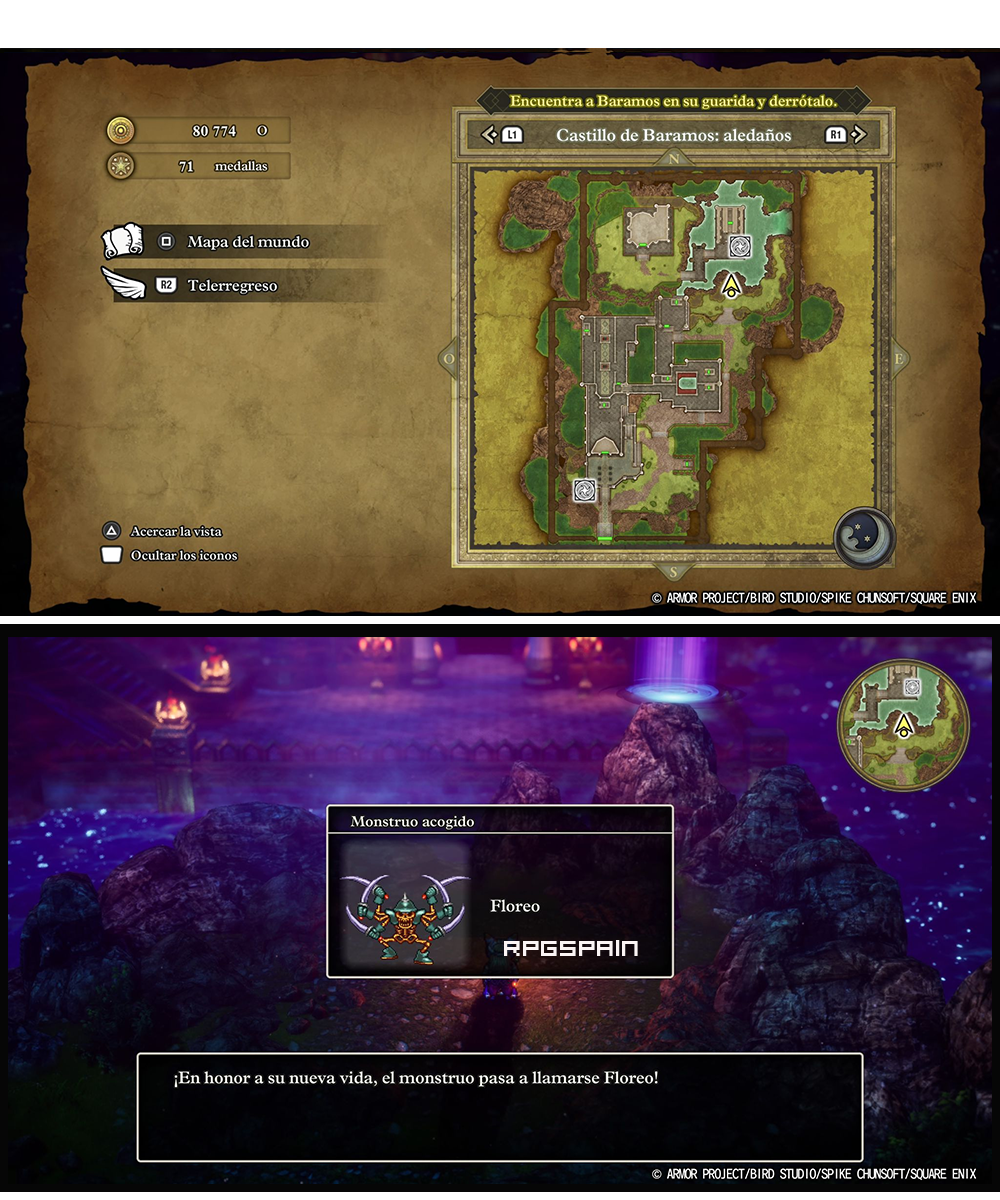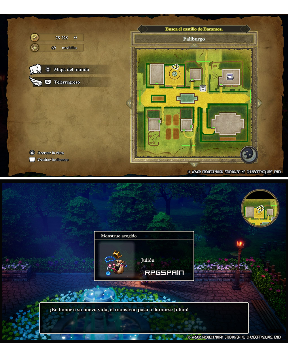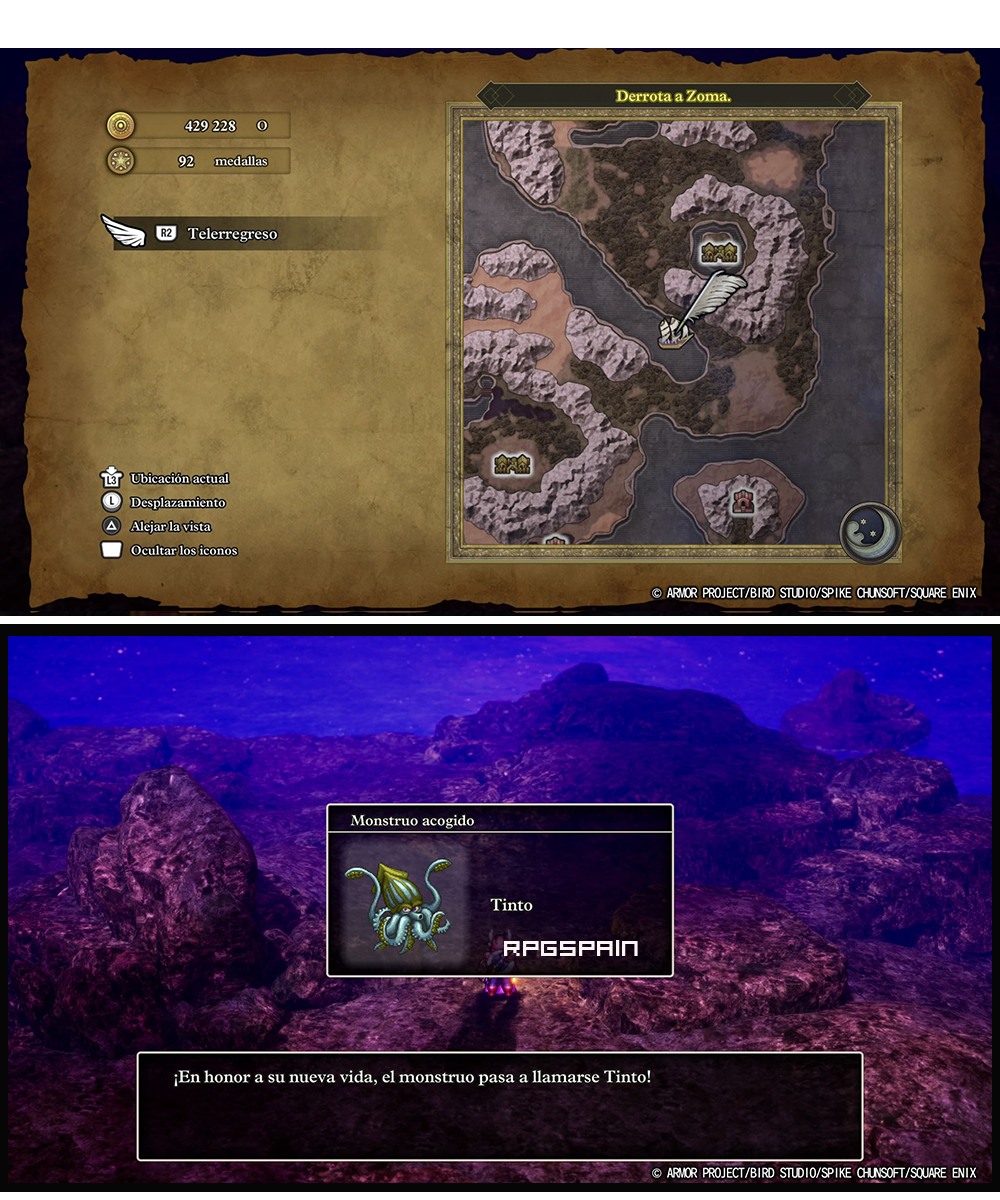Al principio del juego podremos elegir que vocación llevar con los 3 personajes que se unirán a nuestro equipo. Uno debe ser si o si doma bestias y los otros dos estarán bajo vuestro propio criterio. Recomiendo un ladrón y un mago para empezar pero también es muy buena opción llevar un sacerdote y un mago (de hecho fue el equipo que use yo desde el inicio porque aunque el/la protagonista cura, no lo hace igual que un sacerdote. La curva de dificultad también es mayor al inicio y el doma bestias empieza a hacer daño a partir de nivel 20). El juego se puede jugar en el orden que queramos pero yo voy a poner en esta guía la manera que considero más adecuada y la que mejor me funcionó. En los trofeos de historia explicaré como ir avanzando. Asegúrate de mirar todos los puntos brillantes del mapamundi y buscar todos los objetos que hay en las ciudades ya que si no se puede volver un engorro. No uses elixires élficos bajo ningún concepto ni los vendas. Cuidado porque hay dos maneras de guardar diferentes: Una es con los curas/monjas del juego y otro es suspendiendo la aventura desde el menú. Cuando volvamos a jugar para cargar la partida habiendo elegido la primera opción, tendremos que elegir la ranura y cargar. Si hemos suspendido la aventura, tendremos que «retomar la aventura desde el último punto guardado». Parece una tontería pero hasta que lo entendí, llegué a perder mini medallas porque no cargué la partida correctamente. Te dejo un pequeño mapa de referencia para que te sea más fácil investigar el primer tramo del juego. El segundo no lo veo tan necesario y puede contener spoilers por lo que irá apareciendo en la guía de monstruos dóciles y mini medallas: |