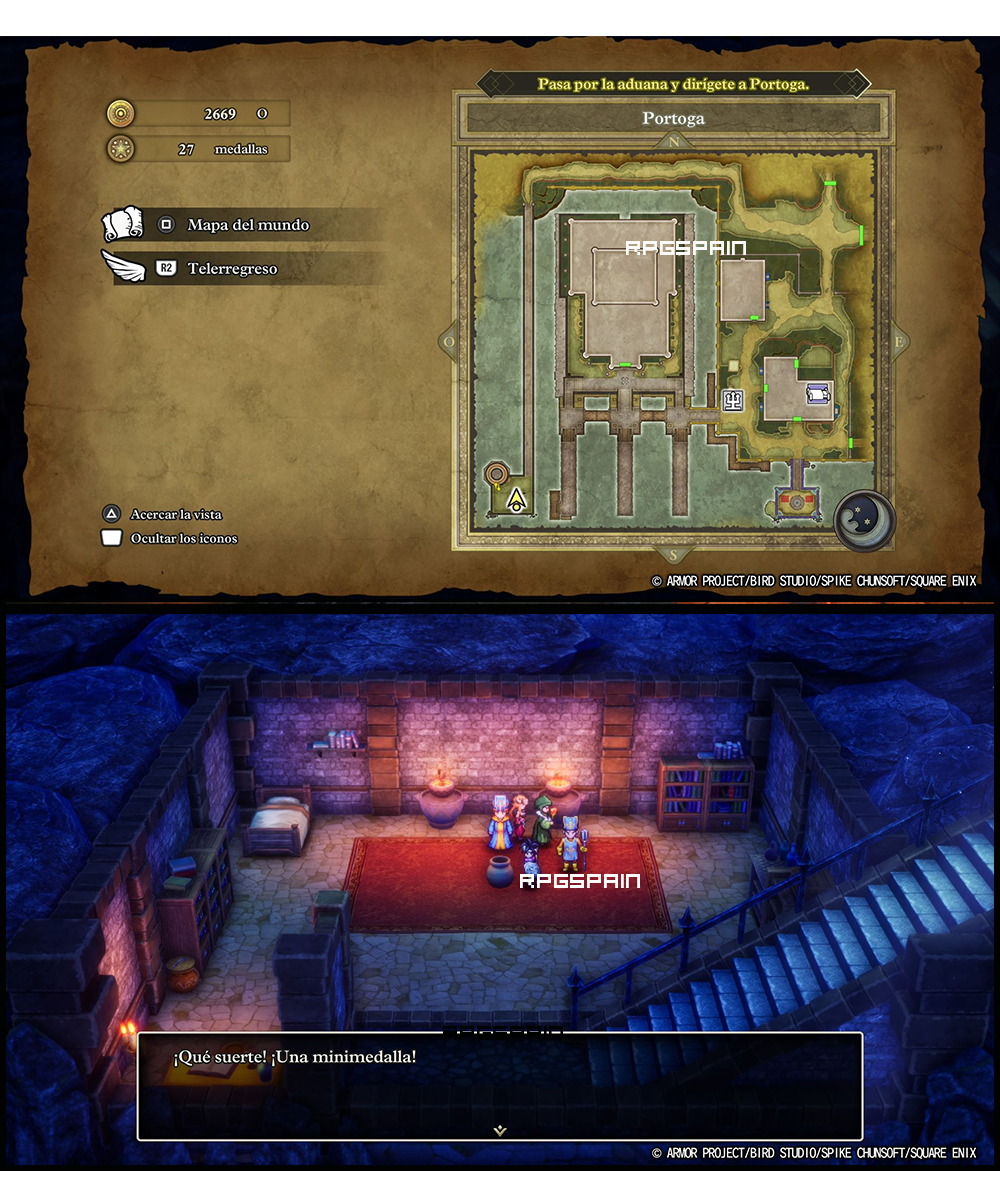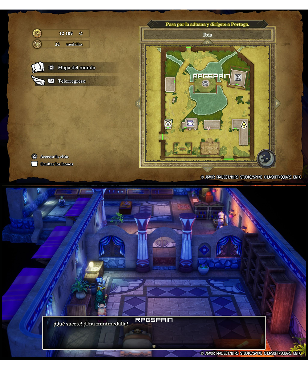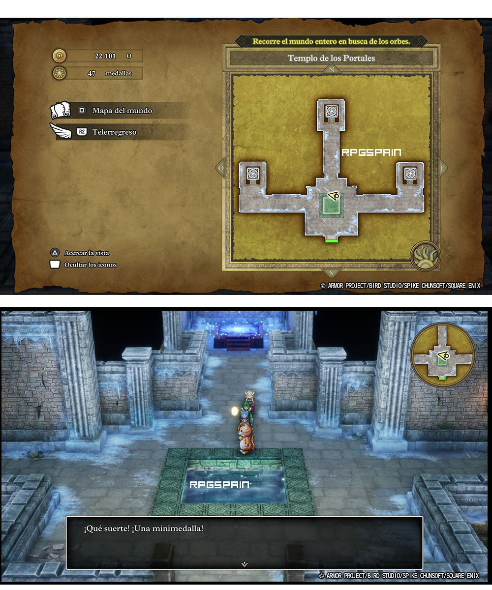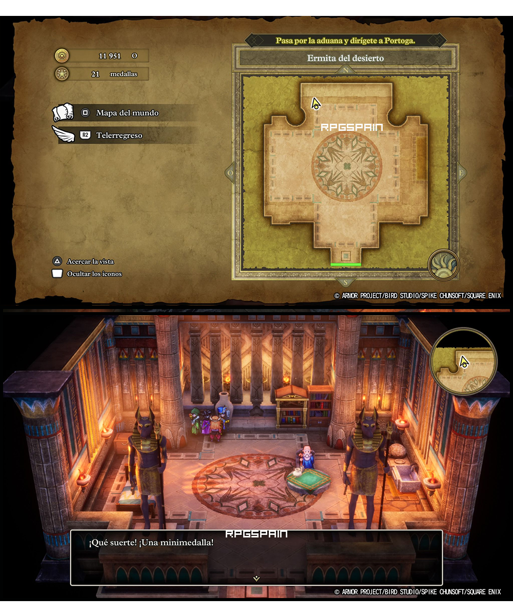 Aquí conseguiremos la llave maestra que nos abrirá todas las puertas del juego (y una mini medalla, que no se olvide). Recomiendo que ahora os deis un paseo por todas las zonas donde hay mini medallas y monstruos dóciles para ir avanzando en su recolección. Ahora vamos a la aduana de Romaria y abrimos la puerta en el pasillo que nos lleva a Portoga para encontrar el templo de los portales. Aquí hay una mini medalla y un monstruo dócil, además de varios teletransportes que nos llevan a zonas diferentes. Nosotros vamos a coger el del este del NPC que guarda (si salimos por la salida sur, también hay bestiario nuevo).