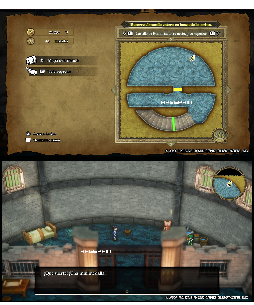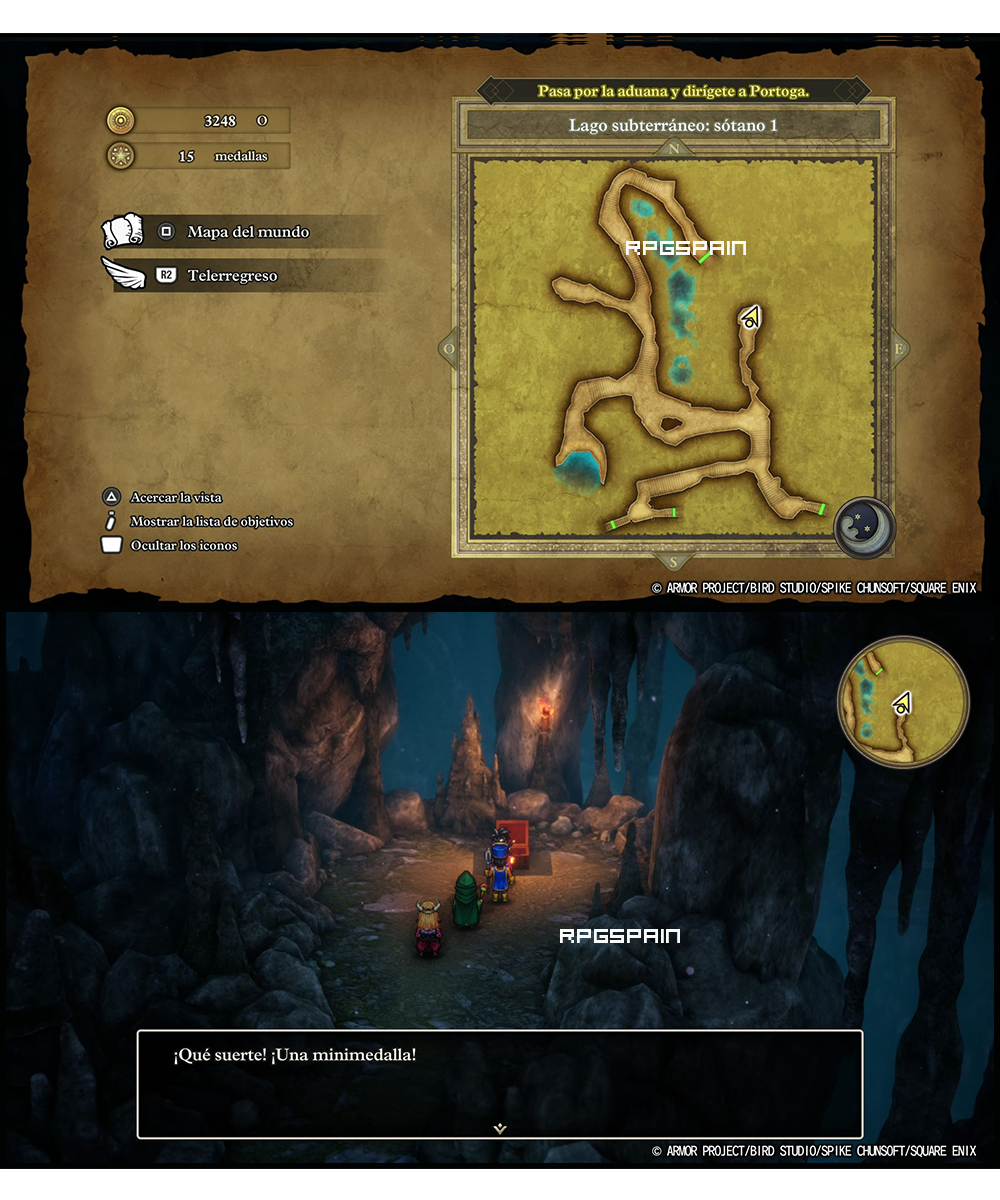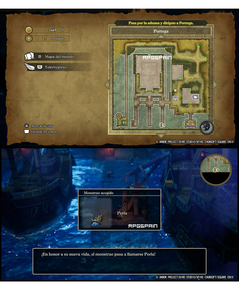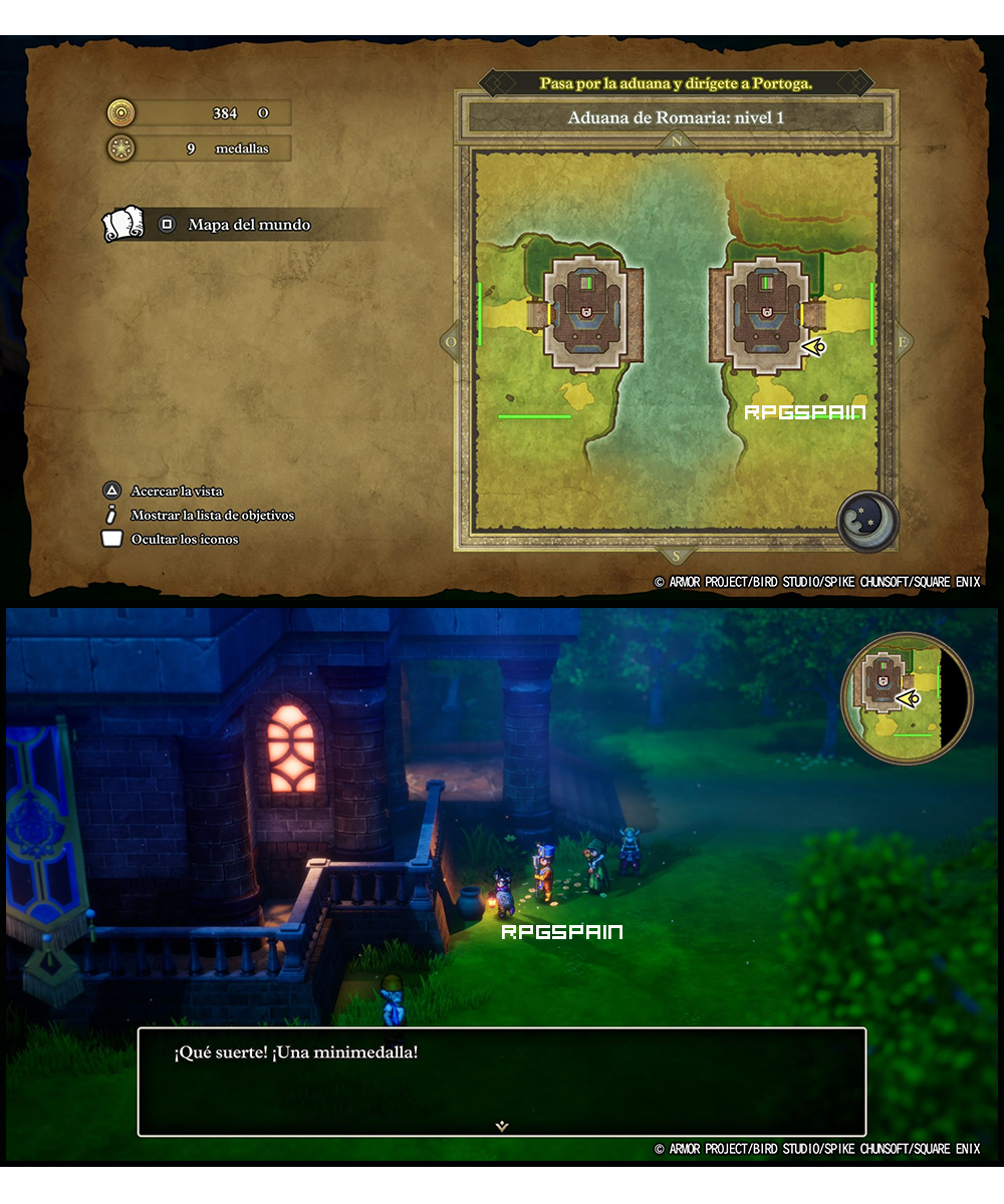 Aquí conseguiremos la llave maestra que nos abrirá todas las puertas del juego (y una mini medalla, que no se olvide). Recomiendo que ahora os deis un paseo por todas las zonas donde hay mini medallas y monstruos dóciles para ir avanzando en su recolección. Ahora vamos a la aduana de Romaria y abrimos la puerta en el pasillo que nos lleva a Portoga para encontrar el templo de los portales. Aquí hay una mini medalla y un monstruo dócil, además de varios teletransportes que nos llevan a zonas diferentes. Nosotros vamos a coger el del este del NPC que guarda (si salimos por la salida sur, también hay bestiario nuevo).