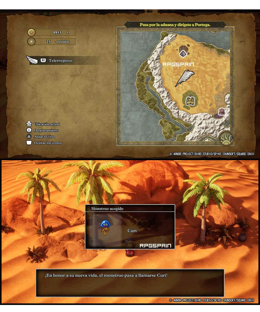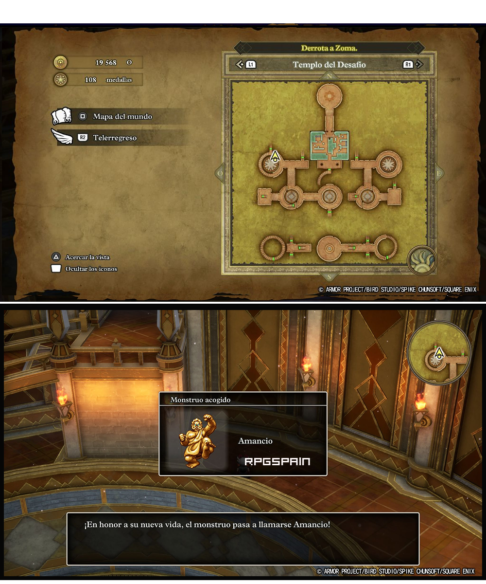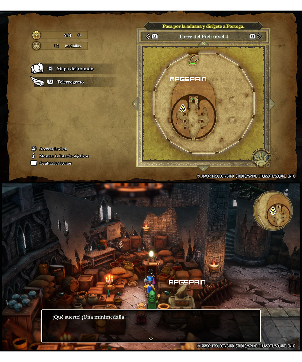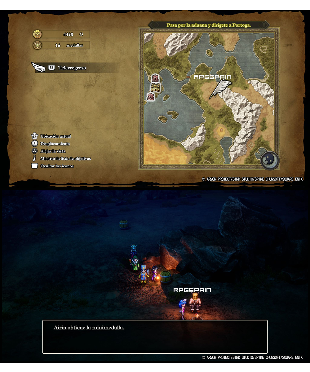 Aquí conseguiremos la llave maestra que nos abrirá todas las puertas del juego (y una mini medalla, que no se olvide). Recomiendo que ahora os deis un paseo por todas las zonas donde hay mini medallas y monstruos dóciles para ir avanzando en su recolección. Ahora vamos a la aduana de Romaria y abrimos la puerta en el pasillo que nos lleva a Portoga para encontrar el templo de los portales. Aquí hay una mini medalla y un monstruo dócil, además de varios teletransportes que nos llevan a zonas diferentes. Nosotros vamos a coger el del este del NPC que guarda (si salimos por la salida sur, también hay bestiario nuevo).