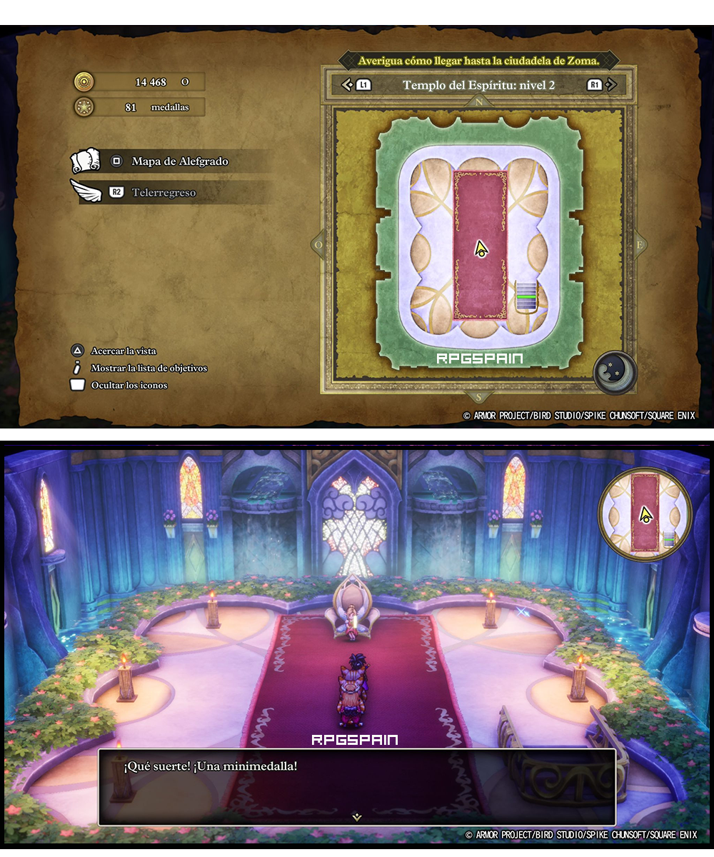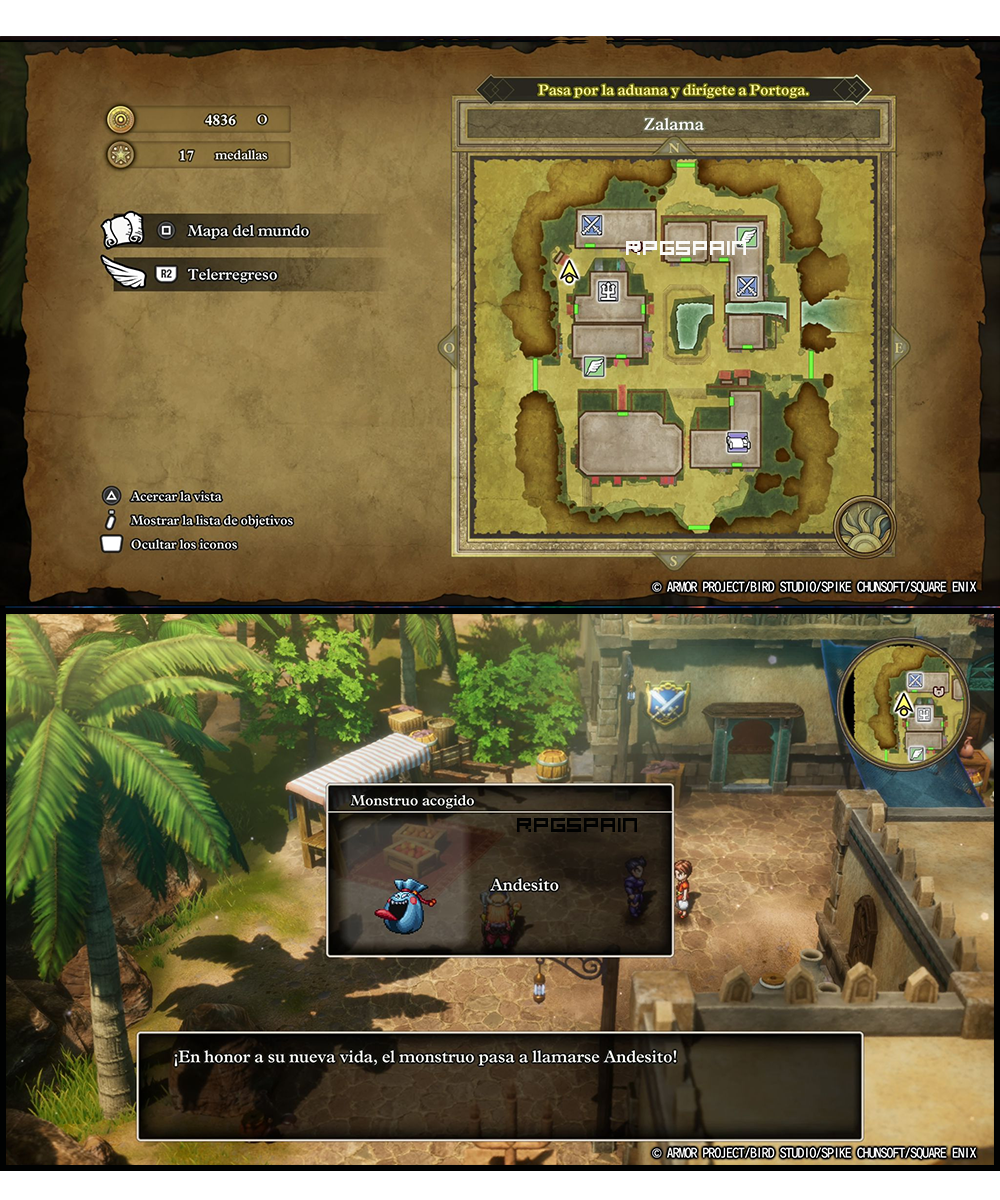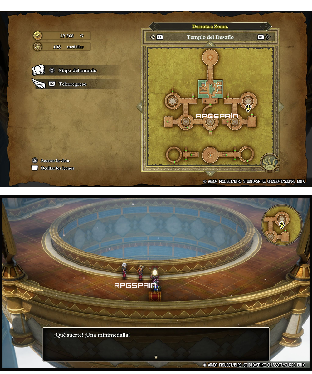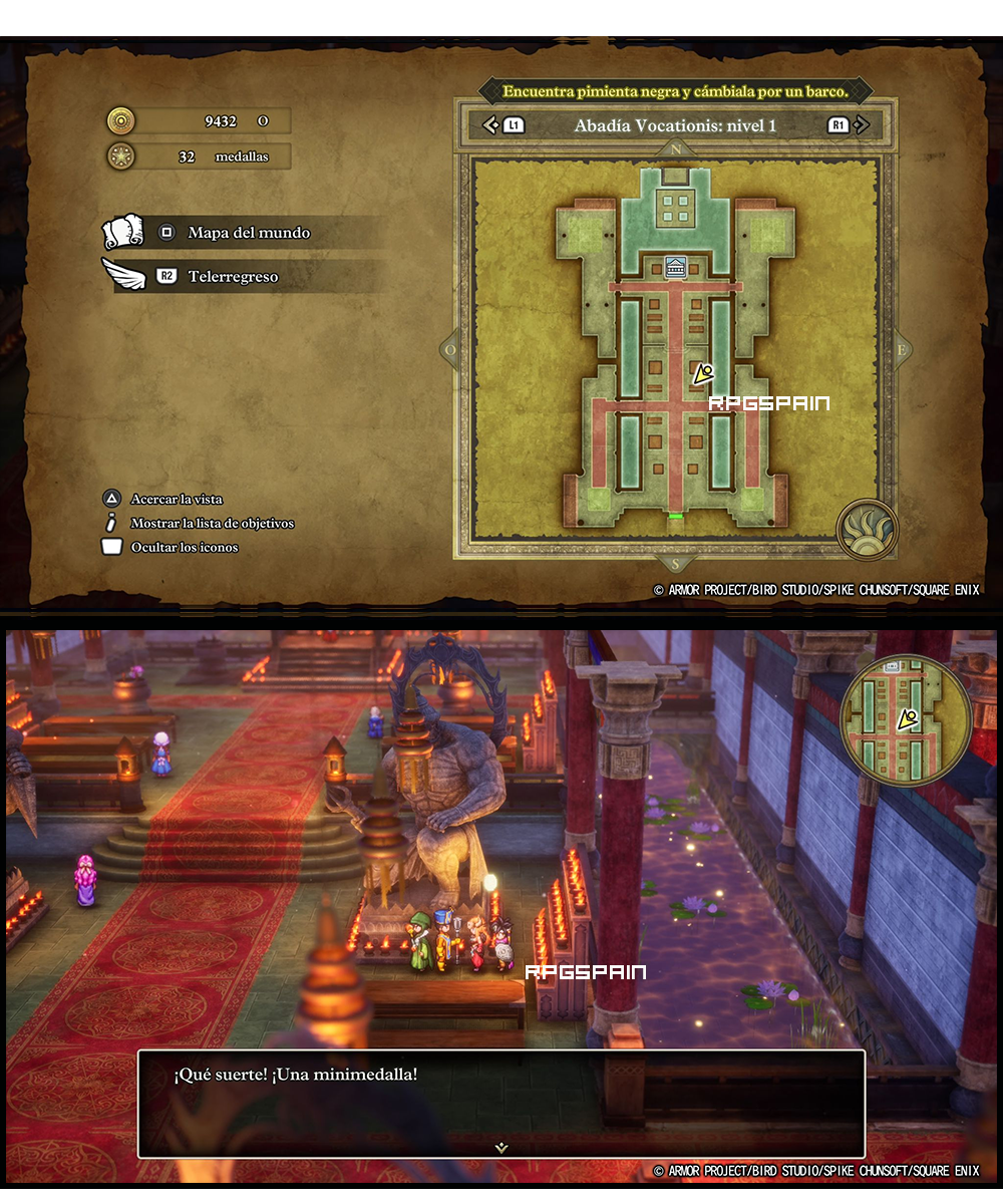 Aquí conseguiremos la llave maestra que nos abrirá todas las puertas del juego (y una mini medalla, que no se olvide). Recomiendo que ahora os deis un paseo por todas las zonas donde hay mini medallas y monstruos dóciles para ir avanzando en su recolección. Ahora vamos a la aduana de Romaria y abrimos la puerta en el pasillo que nos lleva a Portoga para encontrar el templo de los portales. Aquí hay una mini medalla y un monstruo dócil, además de varios teletransportes que nos llevan a zonas diferentes. Nosotros vamos a coger el del este del NPC que guarda (si salimos por la salida sur, también hay bestiario nuevo).