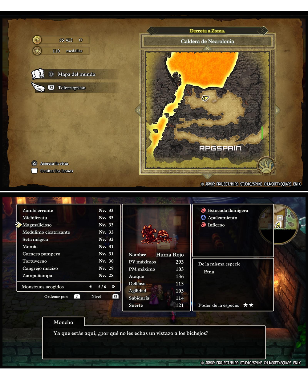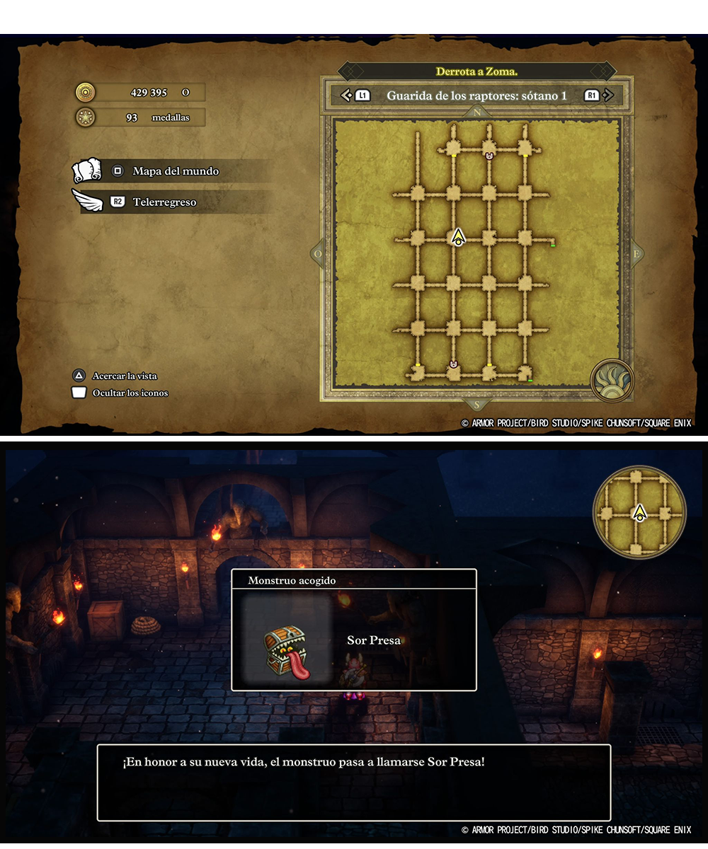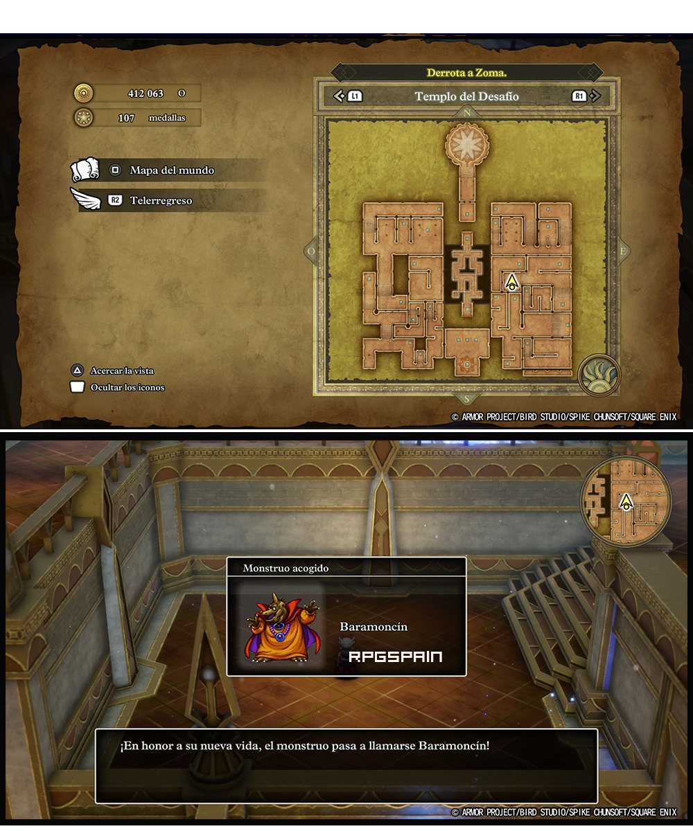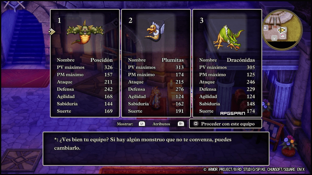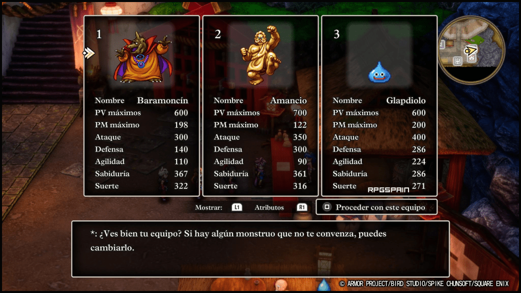 Trofeo de historia (Con el espejo de Ra, podemos hacer muchas cosas así que no olvides ir en busca de los monstruos dóciles que hay alrededor del mundo). Volvemos a Lansún (continente en el extremo sur, el primero empezando por la izquierda) y abrimos la puerta del edificio central con la llave maestra. El problema viene ahora ya que solo podremos entrar con uno de los personajes para completar la prueba (el que sea el líder, así que no olvides cambiarlo desde el menú. En misc-> formación) . Hay monstruos dóciles en esta zona (y bastantes) por lo que el doma bestias sería la mejor opción, peeeero….el jefe no opina lo mismo ya que el doma bestias no tiene habilidades para curarse (a no ser que lo hayas puesto de sabio). Mi recomendación es ir con la/el protagonista (huyendo de todos los combates, a no ser que aparezca un monstruo que nunca hayamos visto) ya que es bastante versátil en combate y una vez que te hayas pasado la mazmorra, volver con el doma bestias para darle punto final. La decisión es tuya.