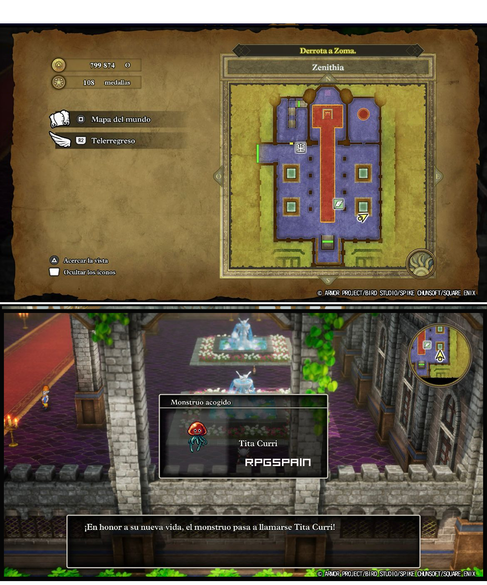 Después de un rato, llegaremos a Zenithia y a la torre del Zénit donde está Xenón arriba del todo. Xenlón nos concederá 7 deseos (uno se desbloqueará después de coger la revista) pero para conseguirlos tendremos que derrotarlo 7 veces (ay, mama). Siendo cada vez más difícil porque tendremos que hacerlo en pocos turnos y tendremos que subir la torre todas las veces ya que nos echará cuando lo derrotemos.